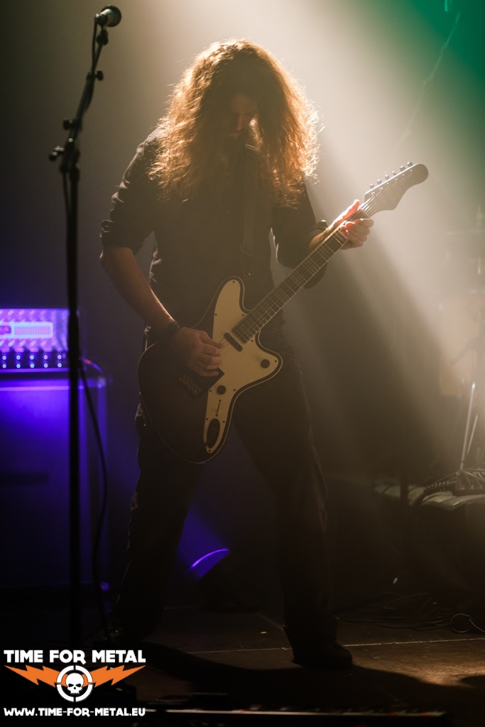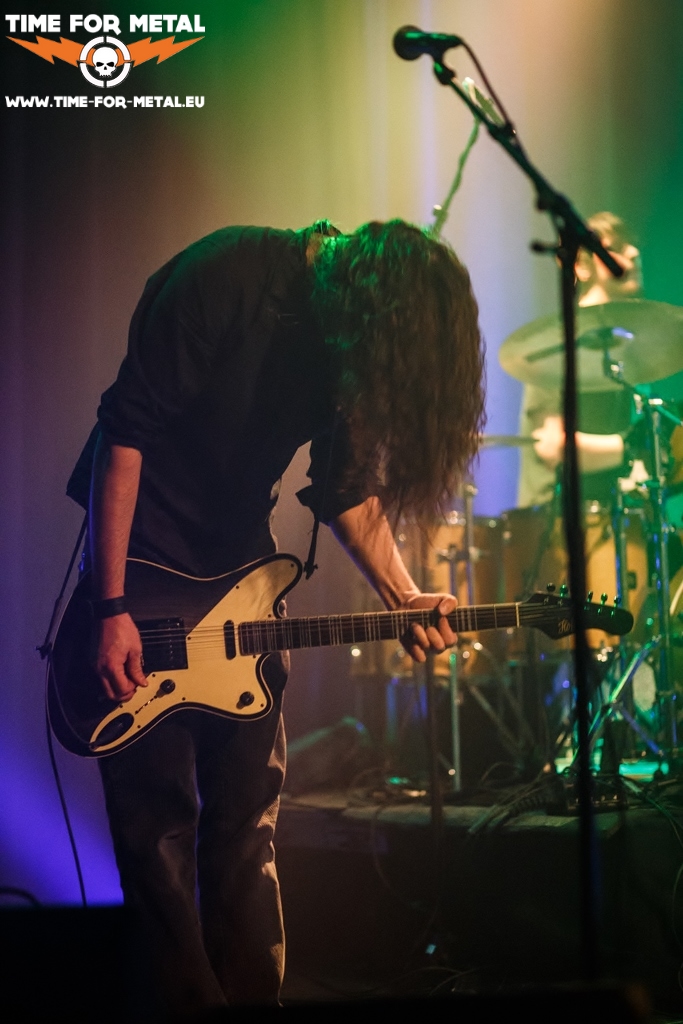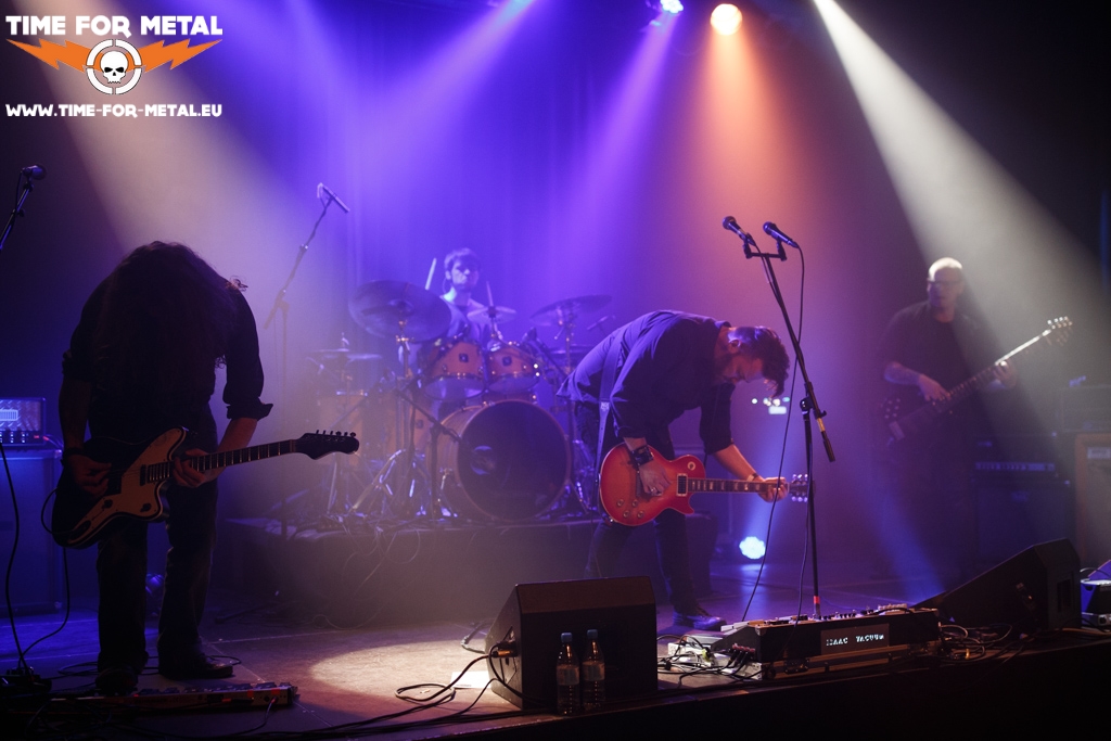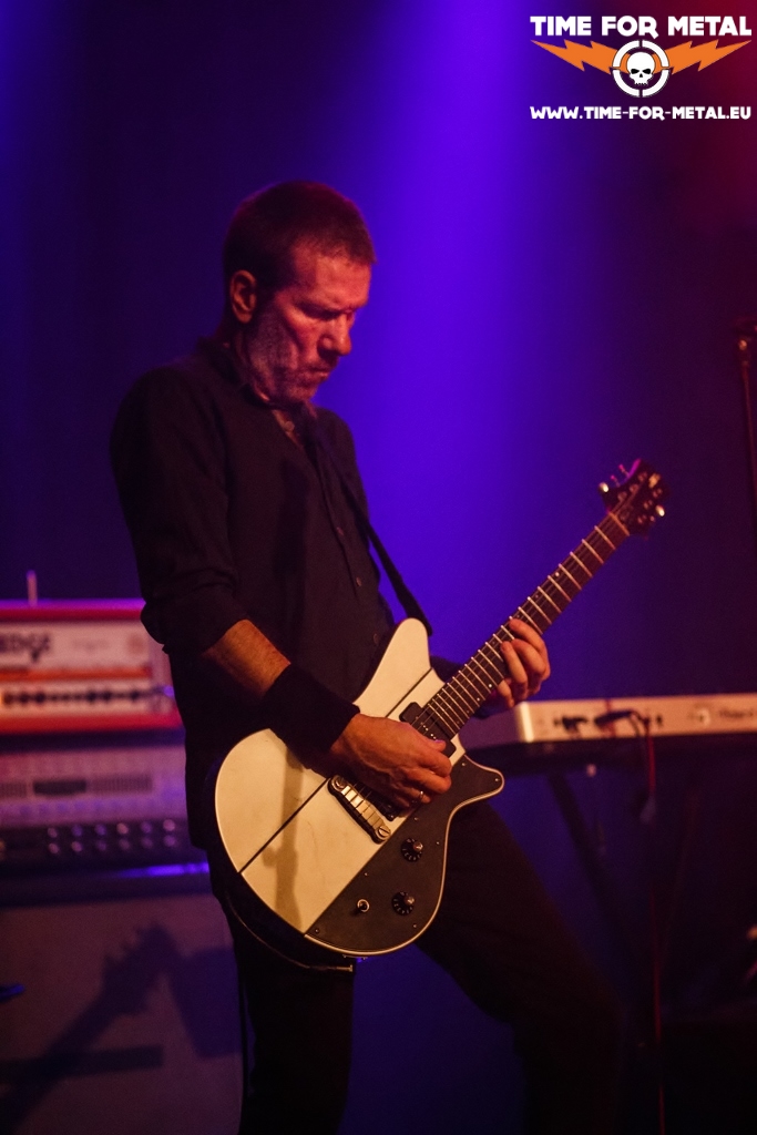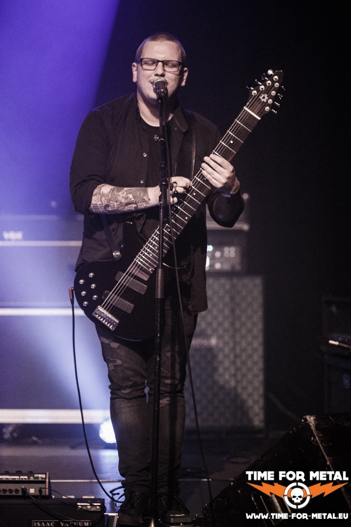 Dann ist es aber endlich so weit, Isaac Vacuum haben zu diesem Abend eingeladen und bitten jetzt zum Tanz. Das Zentrum Altenberg hat für die vier Jungs ja eine ganz besondere Bedeutung, auf die Dan später auch noch eingehen wird. Um es aber meinerseits gleich mal einzufügen: Hier haben Isaac Vacuum den Wettbewerb Best of unsigned gewonnen, und hier habe ich sie im Halbfinale auch zum ersten Mal live erleben dürfen und somit auch kennen gelernt. Schon damals waren vier Tracks auf der Setliste, die Isaac Vacuum zum Sieg geführt haben, nämlich Golem, Double Helix, Karōshi und Nemo, die, bis auf Karōshi, auch ihren Weg auf die heutige Setliste gefunden haben. Ich denke mal, während die Jungs da oben auf der Bühne diese Songs heute spielen, kommen diese schönen Erinnerungen wieder zurück. Damals war im Übrigen das Zentrum Altenberg sehr viel besser gefüllt, es ist wirklich sehr, sehr schade, wie wenig Zuschauer heute den Weg in diese schöne Veranstaltungsstätte gefunden haben. Wenn die Jungs von Isaac Vacuum darüber sicherlich auch enttäuscht sein mögen, lassen sie sich das natürlich nicht anmerken und liefern wieder einmal eine Show, die weder mit akustischen noch mit visuellen Leckerbissen geizt. Sei es die Touchguitar von Stefan, die immer noch viele Blicke auf sich zieht und die er mit einer bewundernswerten Leichtigkeit spielt, oder die mal wieder sehr geschickt am Bühnenrand platzierten Spots, die bei mir in manchen Momenten tatsächlich auch Gedanken an sehr alte Gruselfilme aufkommen lassen. Eingängigkeit ist die Sache von Isaac Vacuum nicht, easy listening geht definitiv anders. Das war aber bereits bei Phyria der Fall, und auch die Black Space Riders haben sich das nicht wirklich zum Motto genommen. Die Songs von Isaac Vacuum sind noch einmal eine Steigerung dazu, und genau dafür liebe ich diese Band. Oder, um mich mal selbst aus meinem Review zu Lords zu zitieren: So mysteriös das Cover des Albums, ist auch die Musik von Isaac Vacuum nicht wirklich eingängig. Teilweise fast schon experimentell, überwiegend ziemlich vertrackt und kaum Haltepunkte für den geneigten Hörer bietend, komme ich mir manchmal vor, wie im dunklen Wald ausgesetzt und allein gelassen. Andererseits kann man nicht umhin, der Musik von Isaac Vacuum weiter zu lauschen und der Virtuosität ganz großen Respekt zu zollen. Wenn man dann noch die Chance hat, die vier mal live zu erleben, sollte man sich diese Gelegenheit nicht entgehen lassen, dann ist das Bild komplett. Ich habe das Bild heute zum wiederholten Male komplettiert und werde mir Isaac Vacuum sicherlich noch diverse Male live gönnen.