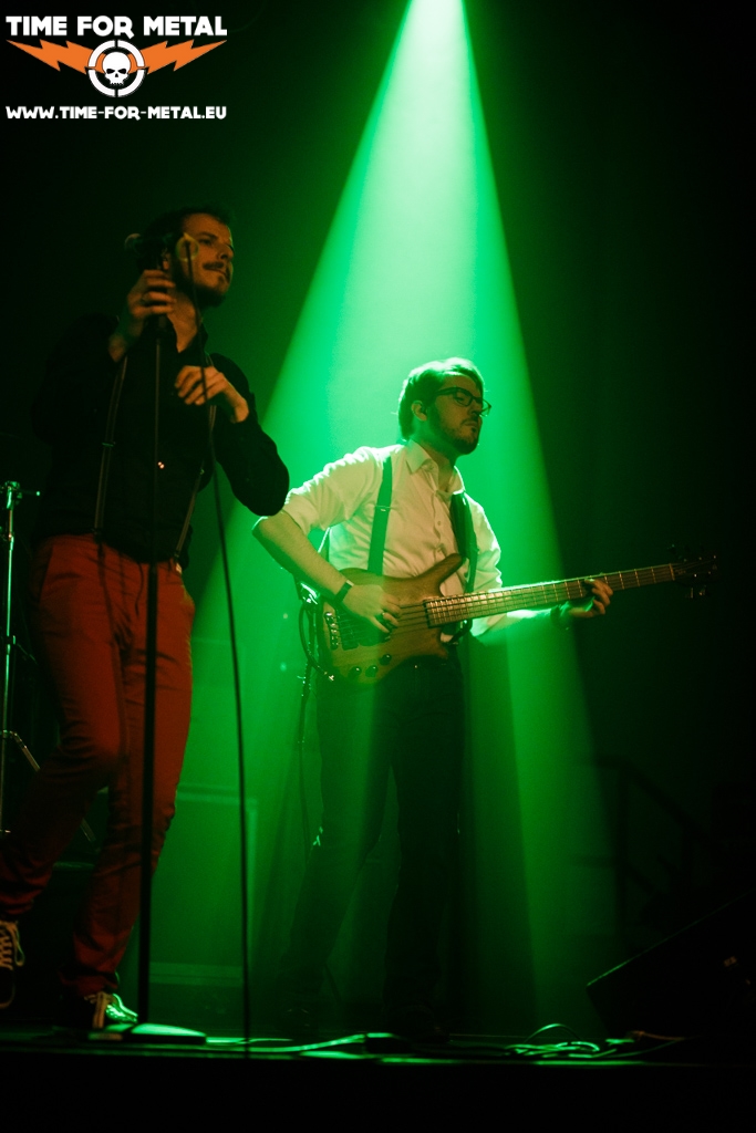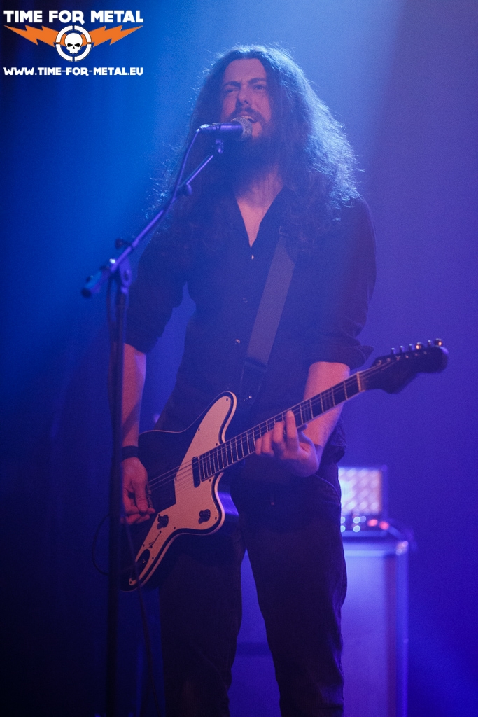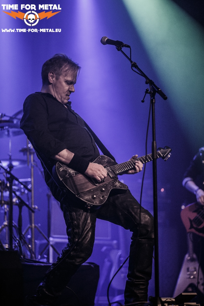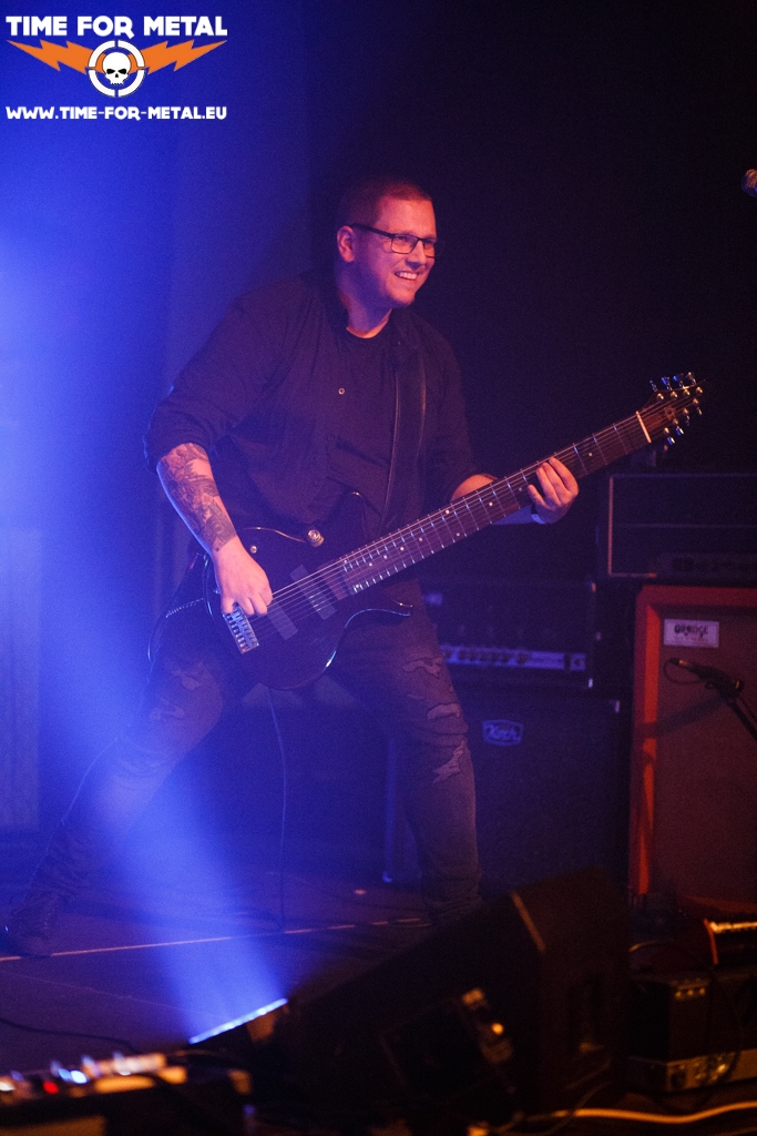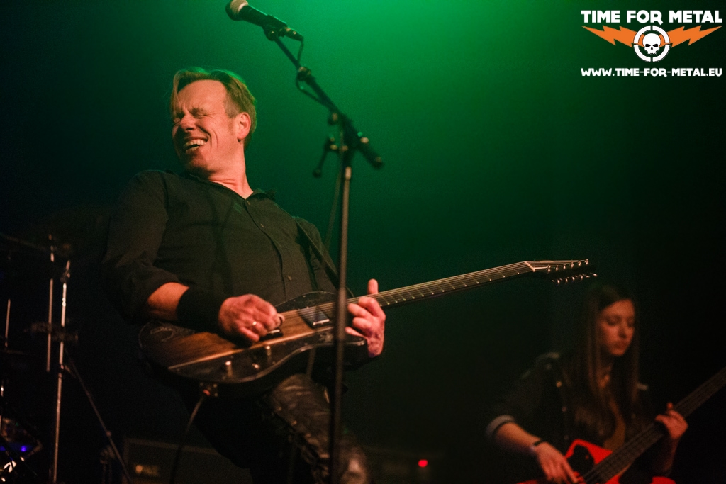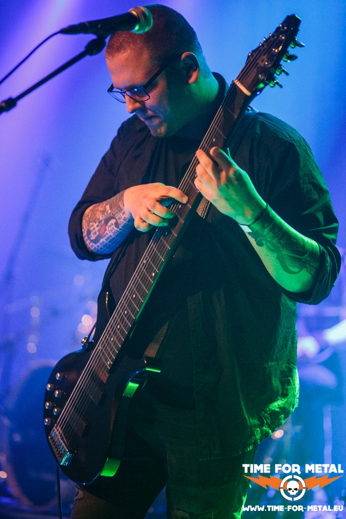 Dann ist es aber endlich so weit, Isaac Vacuum haben zu diesem Abend eingeladen und bitten jetzt zum Tanz. Das Zentrum Altenberg hat für die vier Jungs ja eine ganz besondere Bedeutung, auf die Dan später auch noch eingehen wird. Um es aber meinerseits gleich mal einzufügen: Hier haben Isaac Vacuum den Wettbewerb Best of unsigned gewonnen, und hier habe ich sie im Halbfinale auch zum ersten Mal live erleben dürfen und somit auch kennen gelernt. Schon damals waren vier Tracks auf der Setliste, die Isaac Vacuum zum Sieg geführt haben, nämlich Golem, Double Helix, Karōshi und Nemo, die, bis auf Karōshi, auch ihren Weg auf die heutige Setliste gefunden haben. Ich denke mal, während die Jungs da oben auf der Bühne diese Songs heute spielen, kommen diese schönen Erinnerungen wieder zurück. Damals war im Übrigen das Zentrum Altenberg sehr viel besser gefüllt, es ist wirklich sehr, sehr schade, wie wenig Zuschauer heute den Weg in diese schöne Veranstaltungsstätte gefunden haben. Wenn die Jungs von Isaac Vacuum darüber sicherlich auch enttäuscht sein mögen, lassen sie sich das natürlich nicht anmerken und liefern wieder einmal eine Show, die weder mit akustischen noch mit visuellen Leckerbissen geizt. Sei es die Touchguitar von Stefan, die immer noch viele Blicke auf sich zieht und die er mit einer bewundernswerten Leichtigkeit spielt, oder die mal wieder sehr geschickt am Bühnenrand platzierten Spots, die bei mir in manchen Momenten tatsächlich auch Gedanken an sehr alte Gruselfilme aufkommen lassen. Eingängigkeit ist die Sache von Isaac Vacuum nicht, easy listening geht definitiv anders. Das war aber bereits bei Phyria der Fall, und auch die Black Space Riders haben sich das nicht wirklich zum Motto genommen. Die Songs von Isaac Vacuum sind noch einmal eine Steigerung dazu, und genau dafür liebe ich diese Band. Oder, um mich mal selbst aus meinem Review zu Lords zu zitieren: So mysteriös das Cover des Albums, ist auch die Musik von Isaac Vacuum nicht wirklich eingängig. Teilweise fast schon experimentell, überwiegend ziemlich vertrackt und kaum Haltepunkte für den geneigten Hörer bietend, komme ich mir manchmal vor, wie im dunklen Wald ausgesetzt und allein gelassen. Andererseits kann man nicht umhin, der Musik von Isaac Vacuum weiter zu lauschen und der Virtuosität ganz großen Respekt zu zollen. Wenn man dann noch die Chance hat, die vier mal live zu erleben, sollte man sich diese Gelegenheit nicht entgehen lassen, dann ist das Bild komplett. Ich habe das Bild heute zum wiederholten Male komplettiert und werde mir Isaac Vacuum sicherlich noch diverse Male live gönnen.
