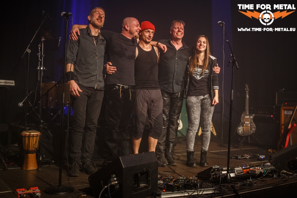 Bei den Black Space Riders stehen jetzt fünf Leute auf der Bühne, und ich sage bewusst nicht „Männer“, denn seit kurzem verstärkt Meike die Band und bearbeitet die dicken Saiten vom Bass. Sieht ziemlich schüchtern aus das Mädel, aber bei dermaßen präsenten Rampensäuen wie Seb und Je kann man sich gern dezent im Hintergrund halten und das solide Fundament für die wieder mal mitreißende Show der Black Space Riders liefern. Die marschieren heute mit riesigen aber sehr entspannten Schritten durch ihre komplette Diskografie und gehen mit dem letzten Track Hide From The Spacelight tatsächlich auch zurück bis ins Jahr 2010. Mein Lieblingssong Give Gravitation To The People darf natürlich auch heute nicht auf der Setliste fehlen, und wird, wie Drummer Crip vor der Show während eines sehr netten Gespräches mit einem Augenzwinkern sagte, wohl auch nie von der Setliste verschwinden. Das wäre mir natürlich sehr recht, wobei ich bei dem Song nie zum Fotografieren komme, weil ich einfach nur tanzen MUSS! 😀 So wäre also das 2014er Album auch berücksichtigt, es war das dritte von den Black Space Riders und trug den passenden Titel D:REI. Aber wie schon geschrieben, Songs von allen Alben sind heute vertreten, auch das 2012er Album Light Is The New Black und natürlich auch das bislang letzte Album Refugeeum aus 2015, dem dann in 2016 noch die EP Beyond Refugeeum folgte. Bereits vor dieser Show hatten die Münsteraner es angekündigt, im kommenden Jahr gibt es neues Futter für die Ohren, und das sogar gleich zwei Mal. Die Releaseshow für Amoretum Vol. 1 ist am 27.01.2018 in Münster, heute gibt es mit Soul Shelter eine Premiere, denn diesen Song spielen die Black Space Riders zum ersten Mal live. So kriegen wir also schon mal einen verheißungsvollen Vorgeschmack auf das, was uns gleich zu Beginn des kommenden Jahres erwartet. Nicht nur vor und nach der Show, sondern auch auf der Bühne präsentieren sich die Black Space Riders heute wieder sehr entspannt aber nichtsdestotrotz hochkonzentriert und können so wieder einmal punkten.