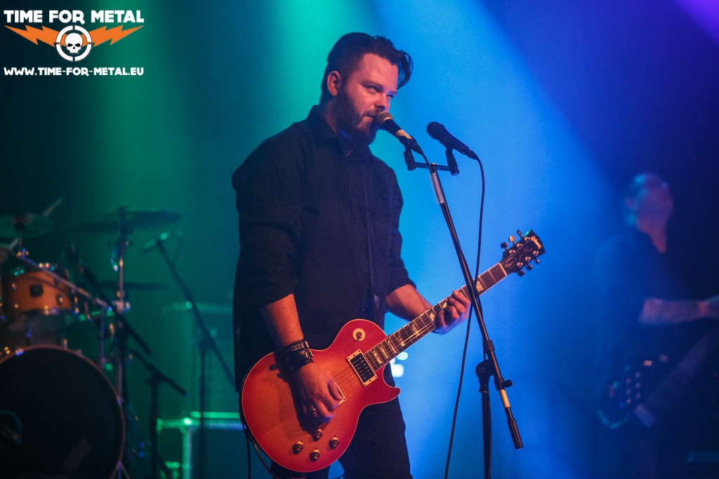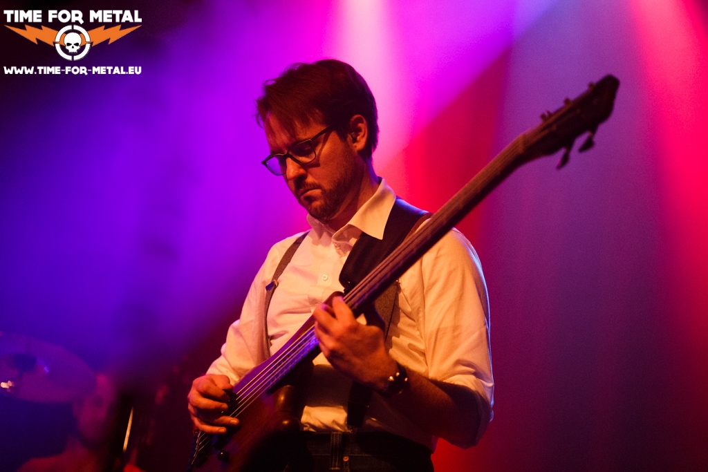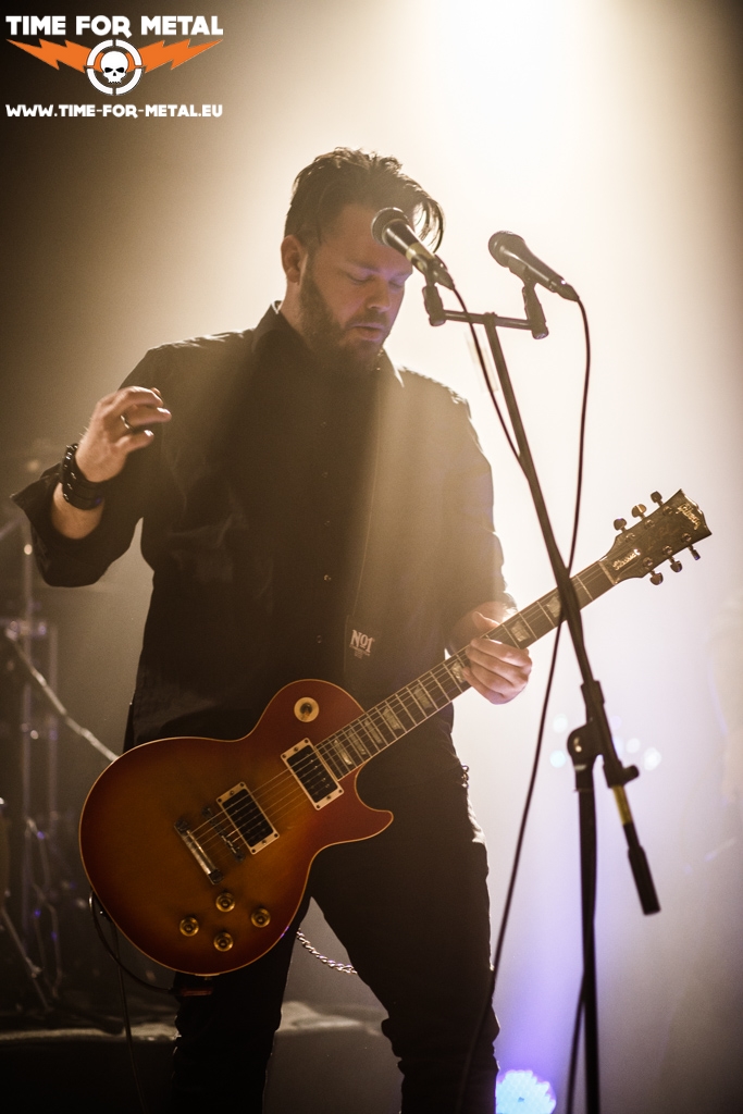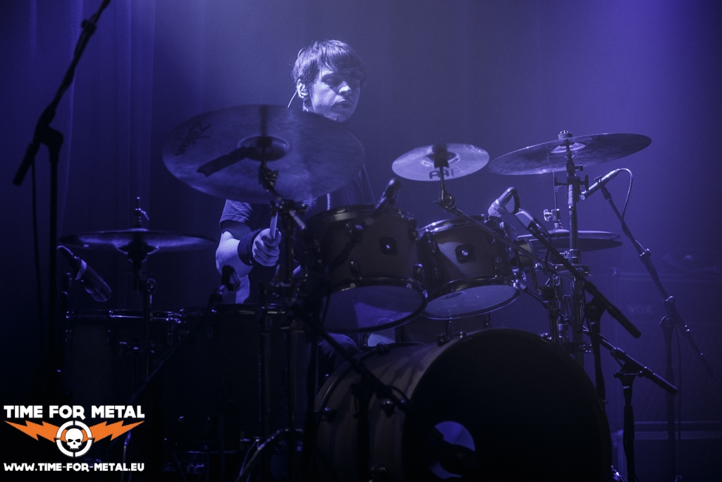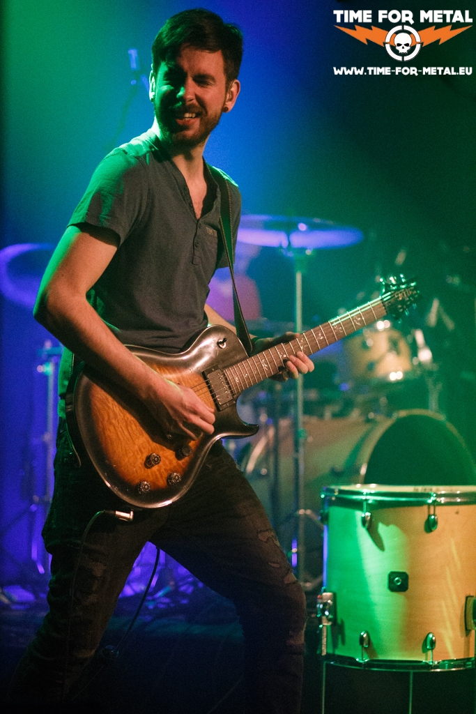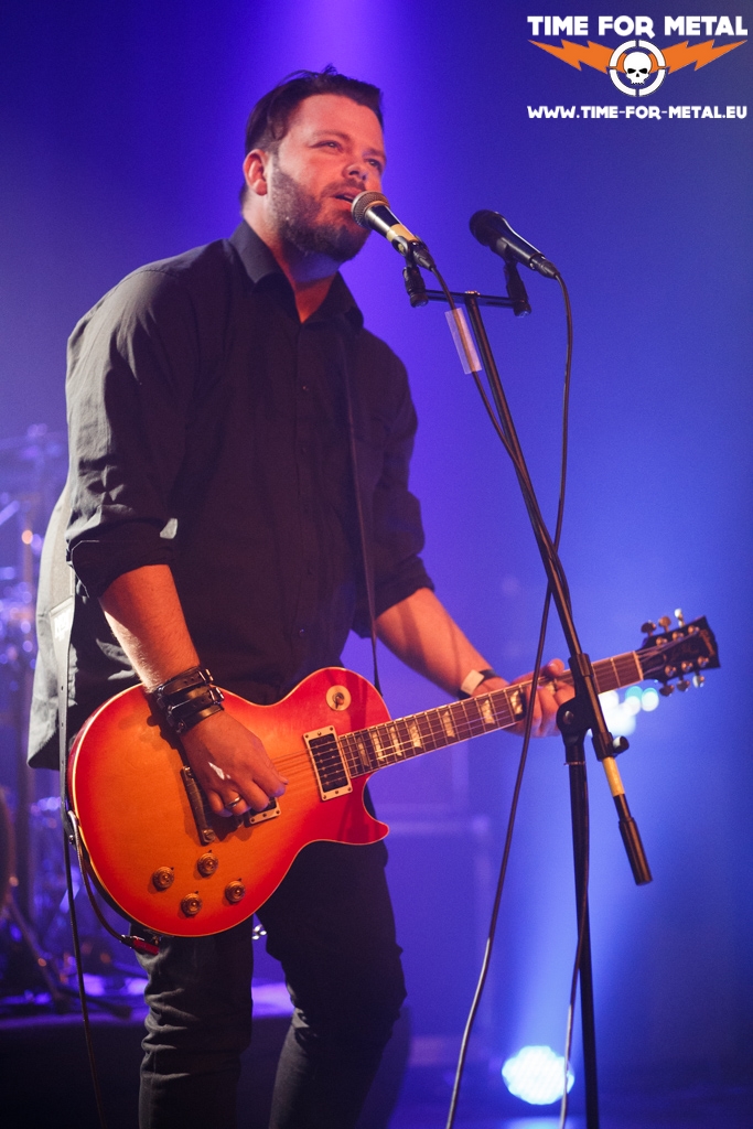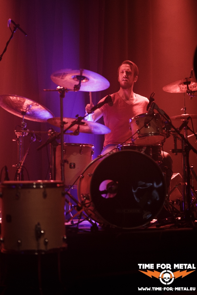 Wie schon geschrieben, die erste Band des Abends, Phyria, war mir bislang vollkommen unbekannt. Gegründet wurde Phyria tatsächlich schon im Jahr 2008, und die vier Männer haben sich Rock bzw. Alternative Rock auf die Fahnen geschrieben. Wenn man dann auf der Facebook-Seite der Band so liest, wo die Männer sich gern mal Inspirationen holen, kann man nur eins denken: Passt! Vor allem der Name dredg schießt mir während der Show von Phyria des Öfteren durchs Hirn, auch Dead Letter Circus oder die nicht von Phyria erwähnten Temple Of Thieves sind nicht ganz so weit weg. Für diejenigen, die alle diese Bands nicht kennen: Sehr melancholisch klingende Songs, über weite Strecken ruhig gehalten, aber immer wieder mit sich leise anschleichenden oder auch überfallartig auftauchenden wahren Eruptionen aufwartend, um sich dann wieder in das Schneckenhaus zurückzuziehen. Es gibt aber tatsächlich auch was zu sehen, dafür sorgt zum einen Gitarrist Jonas, der alle Wendungen der Songs fast schon pantomimisch darstellt und voll in seinem Gitarrenspiel aufgeht, und auch Sänger Benjamin, der sich bei zwei Songs die bereitstehende Floor Tom nach vorne zieht, um ordentlich drauf rumzukloppen – das soll jetzt nicht despektierlich klingen! 😀 Insbesondere Benjamin merkt man schon an, dass er sich sehr freut, heute mit seinen Jungs hier spielen zu dürfen, auch wenn die Halle leider nicht wirklich gut gefüllt ist. Aber Phyria sollten mit den Songs von ihrem neuen Album The Colors Among Us zumindest unter den Freunden von eher ruhigen und melancholischen Klängen den einen oder anderen neuen Fan gewonnen haben können.