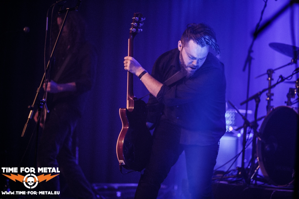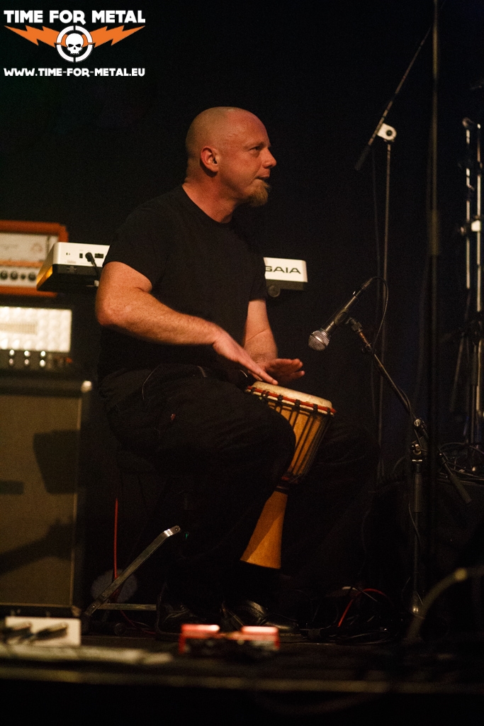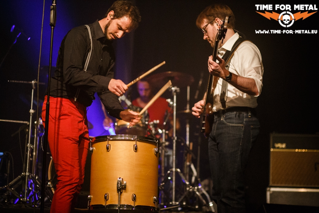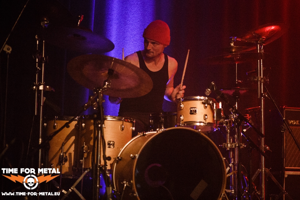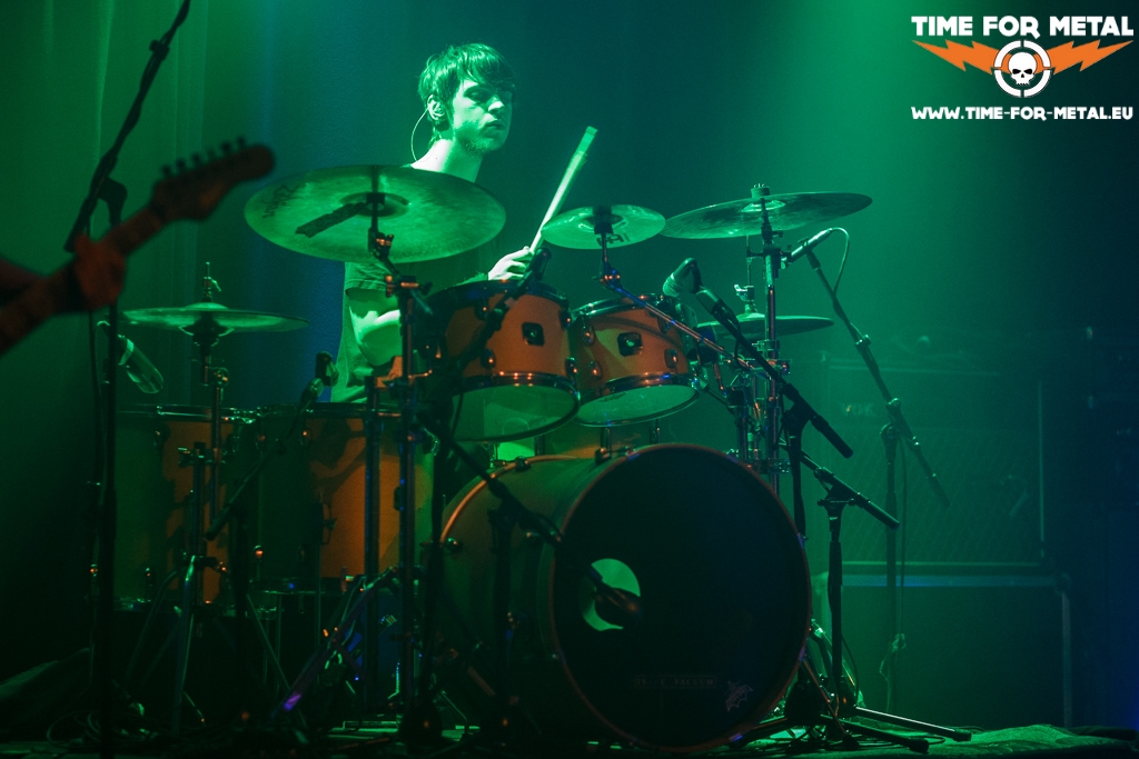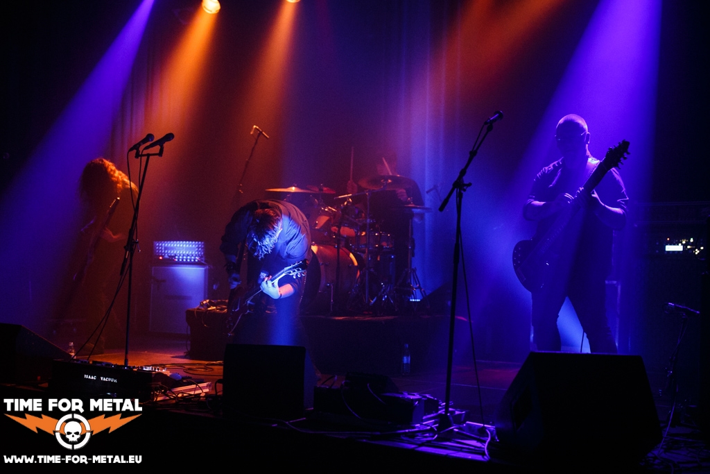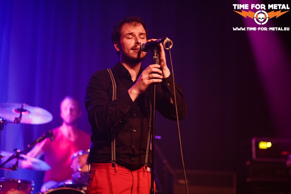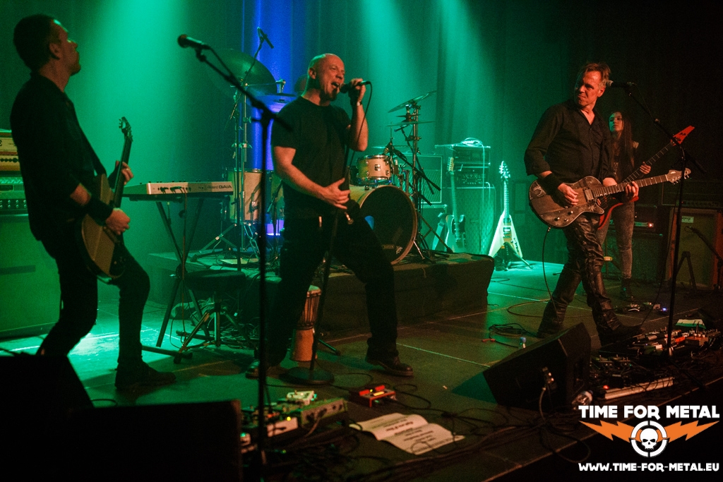 Wie schon geschrieben, die erste Band des Abends, Phyria, war mir bislang vollkommen unbekannt. Gegründet wurde Phyria tatsächlich schon im Jahr 2008, und die vier Männer haben sich Rock bzw. Alternative Rock auf die Fahnen geschrieben. Wenn man dann auf der Facebook-Seite der Band so liest, wo die Männer sich gern mal Inspirationen holen, kann man nur eins denken: Passt! Vor allem der Name dredg schießt mir während der Show von Phyria des Öfteren durchs Hirn, auch Dead Letter Circus oder die nicht von Phyria erwähnten Temple Of Thieves sind nicht ganz so weit weg. Für diejenigen, die alle diese Bands nicht kennen: Sehr melancholisch klingende Songs, über weite Strecken ruhig gehalten, aber immer wieder mit sich leise anschleichenden oder auch überfallartig auftauchenden wahren Eruptionen aufwartend, um sich dann wieder in das Schneckenhaus zurückzuziehen. Es gibt aber tatsächlich auch was zu sehen, dafür sorgt zum einen Gitarrist Jonas, der alle Wendungen der Songs fast schon pantomimisch darstellt und voll in seinem Gitarrenspiel aufgeht, und auch Sänger Benjamin, der sich bei zwei Songs die bereitstehende Floor Tom nach vorne zieht, um ordentlich drauf rumzukloppen – das soll jetzt nicht despektierlich klingen! 😀 Insbesondere Benjamin merkt man schon an, dass er sich sehr freut, heute mit seinen Jungs hier spielen zu dürfen, auch wenn die Halle leider nicht wirklich gut gefüllt ist. Aber Phyria sollten mit den Songs von ihrem neuen Album The Colors Among Us zumindest unter den Freunden von eher ruhigen und melancholischen Klängen den einen oder anderen neuen Fan gewonnen haben können.