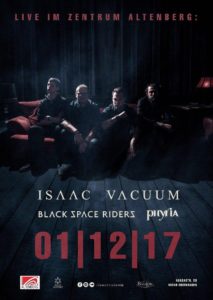 Schon ziemlich lange vor der Show hatte ich die Einladung von Isaac Vacuum angenommen, denn es war doch schon einige Zeit her, dass ich die Jungs mal live erleben durfte. Das Debütalbum Lords, das im März dieses Jahres veröffentlicht wurde, konnte mich ja doch überzeugen, und so freute ich mich darauf, die Songs auch mal live auf die Ohren zu kriegen. Eine Supportband stand bereits fest, die mir bislang unbekannten Phyria vom Niederrhein. Dann kam Mitte Oktober die Nachricht schlechthin – für mich zumindest: Black Space Riders wurden als dritte Band bestätigt. Nach ihrem letzten Album Refugeeum durfte ich sie zum ersten Mal im Mai 2016 bei der Space Prog Night in Essen erleben, und die Männer haben mich damals genau auf dem richtigen Fuß erwischt. So war die Vorfreude auf den heutigen Abend also schon mal sehr groß.