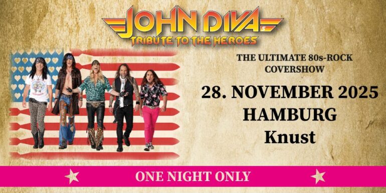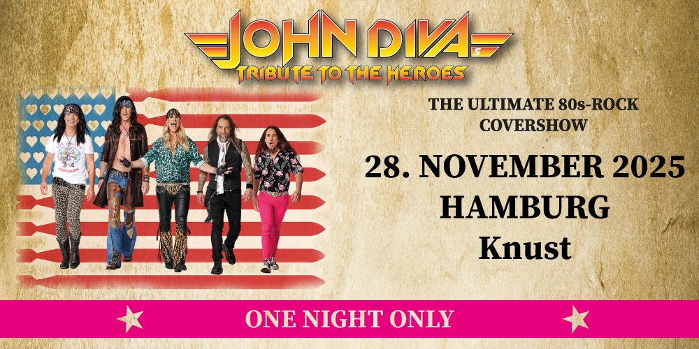 Nach drei erfolgreichen Alben, die allesamt in den deutschen Charts platziert waren, sowie zahlreichen Tourneen und Auftritten bei den wichtigsten Festivals in Deutschland und Europa, kehren John Diva & The Rockets Of Love 2025 mit einer Neuauflage ihrer fulminanten 80s- Rock Tribute Show auf die Bühne zurück. Unter dem Titel John Divas Tribute To The Heroes – denn um nichts anderes geht es hier – nehmen sich John Diva und seine Band wieder die größten Hits des Jahrzehnts zur Brust. Man könnte auch sagen „Back to the Roots“, denn damit ist die Band groß geworden.