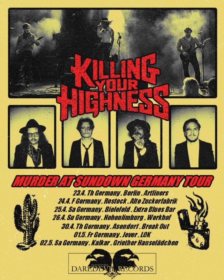 Wenn vier junge Musiker aus dem schwedischen Borlänge beschließen, schnellen, harten Rock’n’Roll mit der staubigen Atmosphäre eines Spaghetti-Westerns zu kreuzen, entsteht eine Band wie Killing Your HighnessBuffalo Al am Bass, Joey Smoke am Mikrofon, Ol’ Man Will an den Drums und Johnny Luck an der Gitarre gründeten die Band 2023 – und machen seitdem genau die Musik, die sie selbst immer hören wollten: kompromisslos, dreckig, energiegeladen.