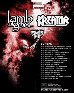 Kreators Mille Petrozza fügt hinzu: „Hordes Of Europe! Es freut mich, die State Of Unrest Tour ankündigen zu können; zu lange war die amerikanische Metalszene gespalten, aber jetzt ist die Zeit der Einheit! Wir freuen uns, unsere einzigen Shows in Europa 2020 mit den mächtigen Lamb Of God und einer unserer liebsten neuen Thrash Bands Power Trip zu spielen. Es wird eine laute Nacht von Metal Partys – Auf keinen Fall verpassen!“