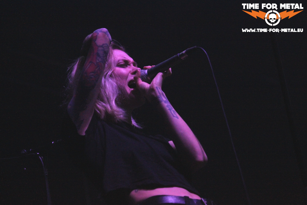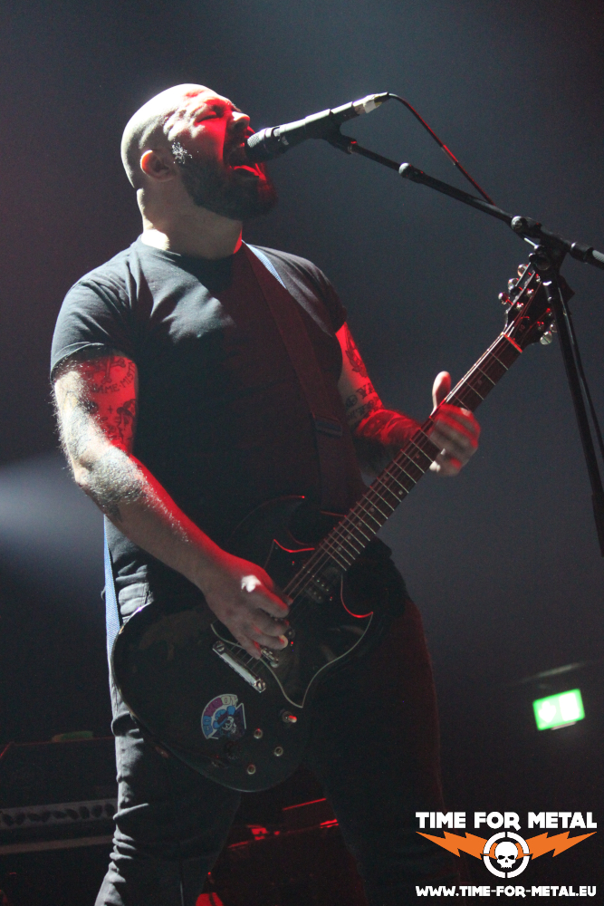 Nachdem im Eingangsbereich das eine oder andere Bier getrunken wird, kommen endlich die Headliner des Abends. Kvelertak betreten die große Bühne. Zwei Wochen lang tragen die sechs Männer ihr neues Werk Splid durch die Welt und das wird an diesem Abend zu Beginn mit dem ersten Song Rogland zeremoniert. Danach folgen mit Ausnahme von Bruane Brenn drei weitere Songs von der neuen Platte an einem Stück. Da kommt zu Beginn bereits viel Freude auf. Ich bekomme es von einer Bekannten bereits im Voraus erzählt und kann es nur bestätigen, dass Sänger Ivar Nikolaisen nicht nur das neue Album, sondern auch die Show auf der Bühne excellent gestaltet. Er passt zur Band wie die Faust aufs Auge. Auch Drummer Håvard macht einen super Job. Die wilden Punkrocker sind nicht zu bändigen, genauso wenig die Fans in den ersten Reihen. Bereits in den ersten Songs schwenkt Ivar mal öfters das Mikrofon zum Publikum. In der anderen Hand hält er ein Glas mit vermutlich etwas Alkoholischem. Das ist alles andere als eine One-Man-Show. Gemeinschaft steht hier an oberster Stelle. Die Gitarristen begleiten ebenfalls mit eigenen Mikros den Gesang, wenn sie nicht gerade ein extra langes Solo spielen.