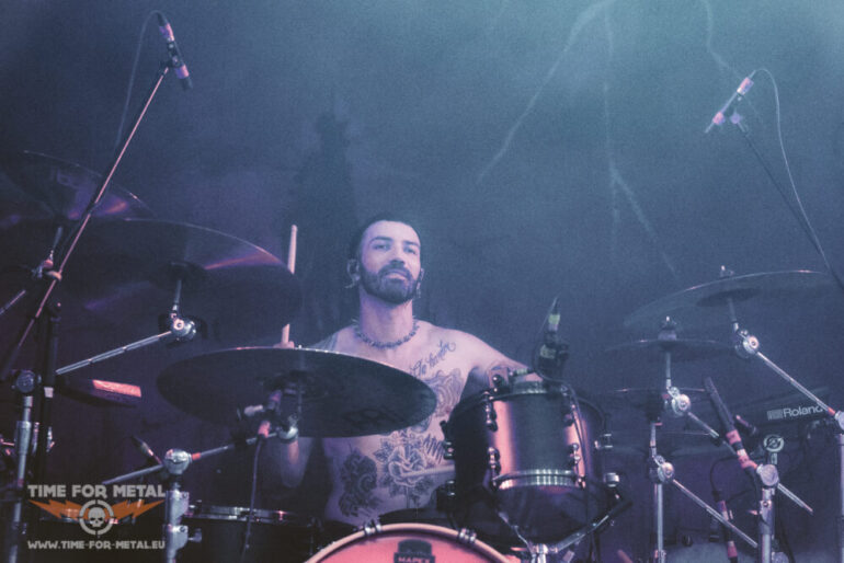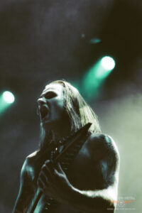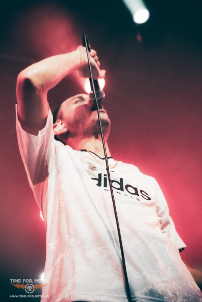 Dann ist es endlich so weit: Landmvrks kommen nach kurzer Umbaupause auf die Bühne. Die ersten Töne des Intros vor dem Rappart von Creature ertönen und die Band – bestehend aus Florent Salfati (Gesang), Nicolas Exposito und Paul „C.Wilson“ Cordebard (Gitarren), Rudy Purkart (Bass) und Kévin D’Agostino (Drums) springen auf die Bühne. Florent legt währenddessen schon mit dem Rappen los. Als I Am The Creature ertönt, gibt es kein Halten mehr. Die Garage kocht. Beim ersten Song landen schon die ersten Crowdsurfer im Graben. Beim dritten Song Blistering wird das Publikum dann aktiv dazu aufgefordert und die Fotografen dürfen auch nur noch von der Seite des Grabens aus fotografieren, damit wir durch die Crowdsurfmenge nicht verletzt werden oder die Securitys behindern. Beim zweiten Song Death kommt Drew mit auf die Bühne. Die ersten drei Songs haben den Grundstein für einen fantastischen Auftritt gelegt. Es geht weiter mit A Line In The Dust. Salfatis Gesang wechselt mühelos zwischen Cleans, Shouts, Screams, Rap-Parts und klaren Melodien. Er hat eine unfassbare Bühnenpräsenz, die das Publikum schnell verzaubern lässt. Ich glaube, darin liegt auch ein Stück der Faszination, die viele für die Band entwickeln. Die Breakdowns sitzen, besonders bei Sulfur! Hier wird dann die Wall of Death auf ein Maximum ausgedehnt und das Konzert hat hier den Peak. Die Setlist bietet eine gute Balance aus alt und neu – aus ruhigeren und härteren Parts. Bei Sombre 16 wird wie gewohnt von Florent auf eine Leinwand das V mit Graffiti gesprüht. Danach spielen sie Say No Word an und Zelli leistet der Band auf der Bühne Gesellschaft,
