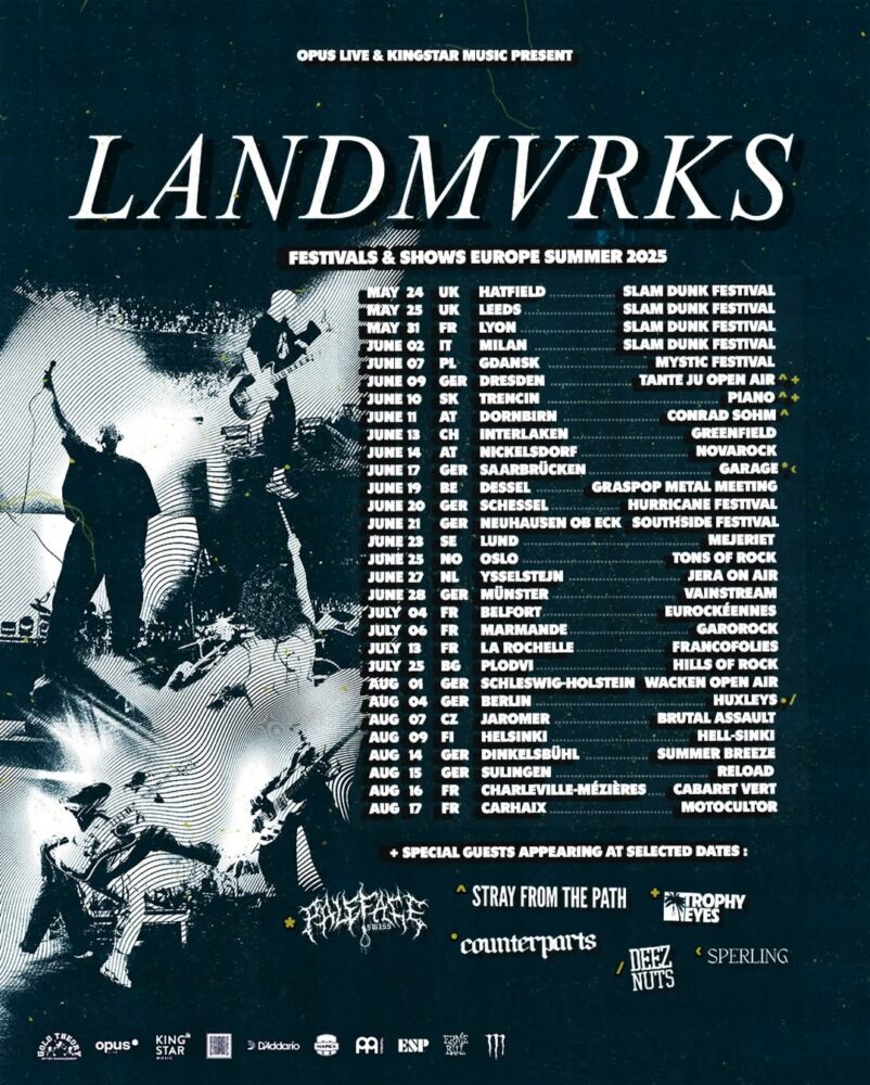 Es ist Dienstagabend in Saarbrücken, es ist warm, ein schöner Sommertag. Kurz vor Beginn um 19 Uhr herrscht vor der Garage noch ordentlich Trubel. Der Nightliner parkt vor dem Club, draußen stehen einige Fans. Drinnen ist der Laden auch schon gut gefüllt. Die Garage ist ausverkauft. 1.000 Köpfe freuen sich auf das unglaublich gute Line-Up, das heute Abend geboten wird. Alle haben richtig Bock. Irgendetwas Besonderes liegt in der Luft, ich kann es nicht beschreiben, aber es fühlt sich so an, als ob alles zusammenpasst heute. Ich bin auf alle Fälle richtig guter Dinge und freue mich riesig, Landmvrks in einer kleinen Clubatmosphäre endlich einmal live sehen zu können. Zwischen den Festivals stehen auf ihrer Agenda ein paar wenige Clubkonzerte, bevor es im Dezember dann auf eigene Headliner-Tour durch Europa geht. Nach Veröffentlichung von The Darkest Place I’ve Ever Been, Ende April 2025, gleiten die fünf Jungs aus Marseille gerade auf einer Erfolgswelle und gewinnen mit jeder Show neue Fans, wenn man dies an den Followerzahlen in den sozialen Medien bemessen will. Was auf Platte schon von vielen gefeiert wird, sollen die Jungs mit ihren Liveauftritten wohl noch toppen. So sind vor Ort schätzungsweise ca. 70 Prozent aller Leute anwesend, die schon mindestens ein Konzert von Landmvrks besucht haben, was ich feststelle, nachdem Florent Salfati während des Auftrittes fragt, wer die Band schon einmal live gesehen hat. Auch die Vorbands, die heute Abend auftreten werden, können sich mehr als sehen lassen. Ein Geschenk für Hardcore und Deathcore Fans. Sperling, Stray From The Path und Paleface Swiss.