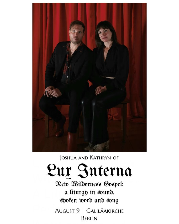 Der American-Dark-Folk-Act Lux Interna hat am 2. Mai 2025 sein neues Album New Wilderness Gospel veröffentlicht. In den kommenden Wochen wird die Band bei zwei Gelegenheiten in Europa zu sehen sein – zunächst mit einer intimen Duo-Performance am 09. August in der Galiläakirche in Berlin, Deutschland, gefolgt von einem Salon in der Embassy Of The Free Mind am 16. August in Amsterdam, Niederlande.
