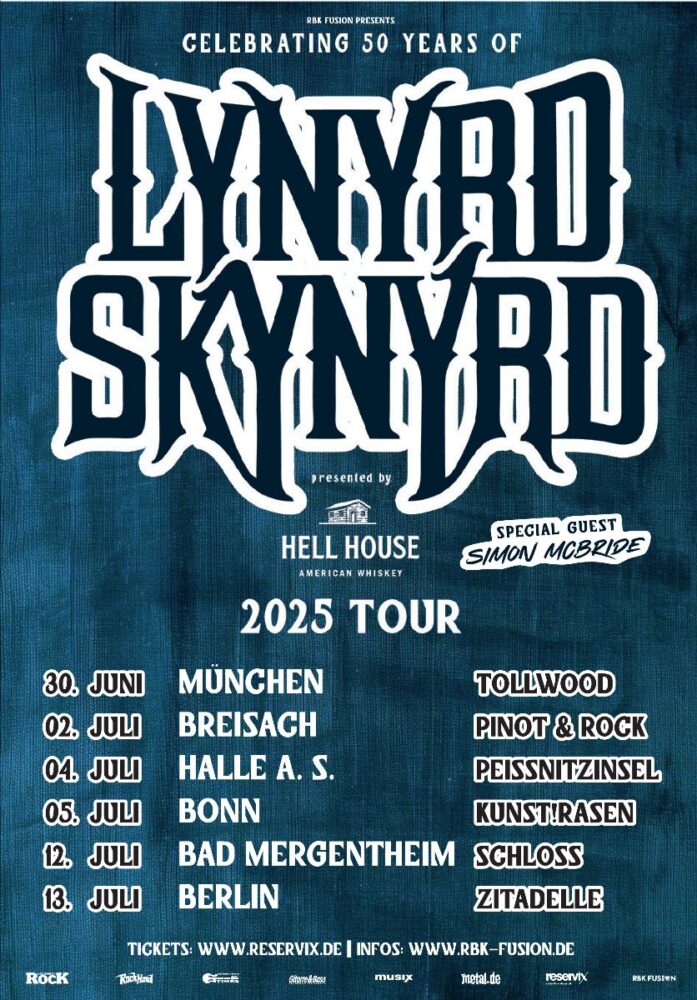 Die US-amerikanische Rock-Institution wird ab dem 30. Juni im Rahmen ihrer Lynyrd Skynyrd – Celebrating 50 Years – 2025 Tour bei sechs Shows auf den deutschen Bühnen zu sehen sein.