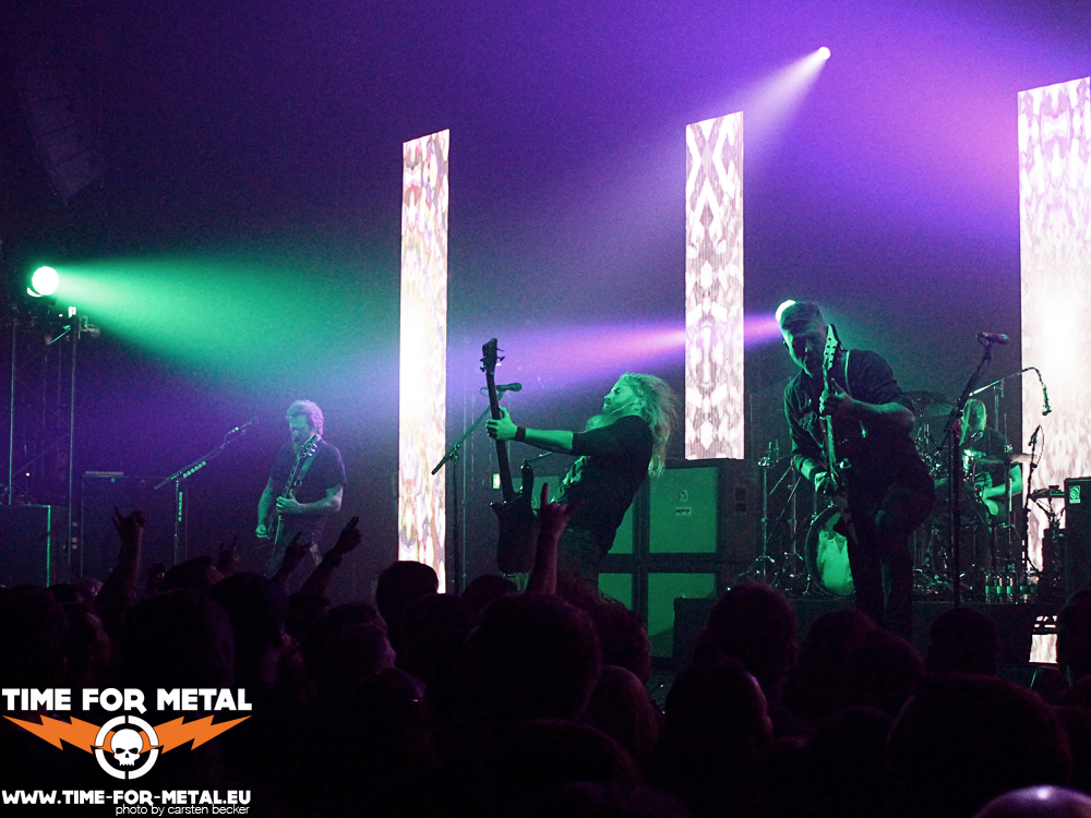 Nach kurzer Umbaupause und als viele noch vergeblich auf das Backdrop der Band warten, starten Mastodon um 21:45 mit ihrem Set. The Last Baron heißt der Opener vom 2009er Album Crack The Skye. Ein 13 Minuten Stück zu Beginn ist gewagt und wie zu erwarten wird das Publikum gegen Ende des Songs etwas müde. Es scheint allerdings, als wäre das von der Band so gewollt. Nach dem Song beginnen die zahlreichen schmalen LED-Wände auf der Bühne ihr buntes Farbenspiel und das Intro zu Sultan’s Curse (Emperor Of Sand) ertönt. Das Publikum ist wie elektrisiert und von jetzt auf gleich ist die volle Intensität eines Mastodon-Gigs zu spüren. Die Licht-Effekte, die ausschweifenden Songs und die wechselnden Vocals sind stimmungsvoll, es wird viel Wert auf die Gesamtproduktion gelegt – das sieht man in der Welt des Metal nicht so häufig. Leider wirkt die Stimme von Gitarrist Brent Hinds während der ersten Songs noch etwas schwächlich, er fängt sich aber im Laufe des Abends. Ansonsten steht die Band voll im Saft, ist aber wie üblich sehr auf ihre Instrumente fokussiert. Die Interaktion mit dem Publikum wird auf ein Mindestmaß beschränkt. Immerhin sitzen die kurzen und humorvollen Ansagen von Troy Sanders zwischen den Songs. Einen Defekt an seinem Bass kaschiert er, indem er erwähnt, dass heute sein Geburtstag sei – das Publikum revanchiert sich prompt mit einem kleinen Ständchen.