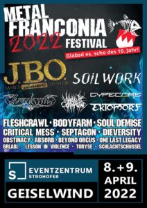 Zwei Jahre müssen Fans und Veranstalter auf ihr zehnjähriges Jubiläum warten. Am achten und neunten April ist es endlich so weit: In der Musichall in Geiselwind hat man einen neuen Veranstaltungsort gefunden, der dem Metal Franconia entspricht! Und zudem finden dort eh’ die meisten Konzerte und Festivals in der fränkischen Metalszene statt, sprich Routiniers treffen auf ein eingespieltes Team.