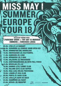 Die aus Ohio stammenden Metalcore-Kings Miss May I kündigen heute ihre kommende Sommer-Tour durch Europa an, die sowohl zahlreiche Festival-Shows wie auch ausgewählte Shows mit Parkway Drive (PD), Thy Art Is Murder (TAIM), Emmure (EM) und/oder Knocked Loose (KL) beinhalten wird! Zudem dürfen sich Fans aus Litauen, Estland, Lettland und Portugal über einige Headline-Shows der Band freuen. Eine komplette Übersicht aller anstehenden Termine findet ihr hier: