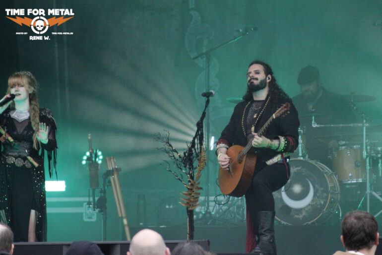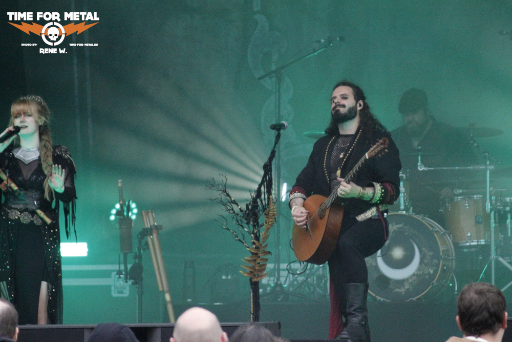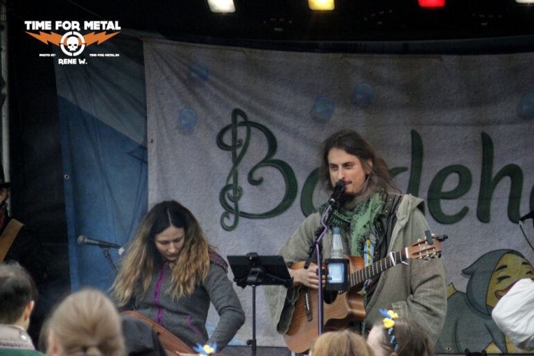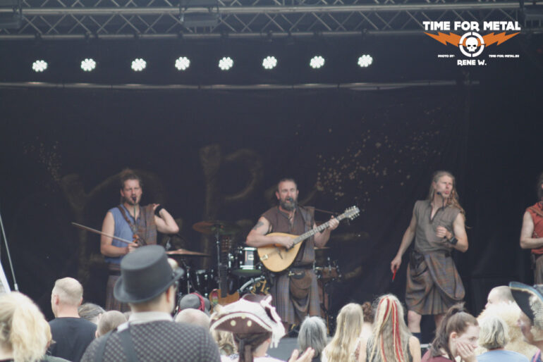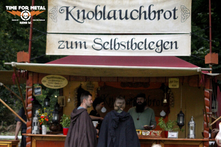 Uns zieht es zu Waldkauz, den Opener der Musikarena MPS Bühne. Was direkt auffällt, ist, dass nicht wie in den Vorjahren ein Stand mit Speisen in der Musikarena zu finden ist. Der Grund klärt sich schnell auf. Der eingeplante Stand fällt aufgrund von Krankheit aus und ein Ersatz ist schlichtweg spontan nicht zu finden. Auf eine Lösung lässt der Veranstalter nicht lange warten und bietet ab dem morgigen Freitag vergünstigte Kombitickets an, um reinen Konzertbesuchern die Möglichkeit zu geben, auf dem eigentlichen Markt was Warmes zu essen erstehen zu können. Wie gewohnt unaufgeregt werden Probleme nicht totdiskutiert, sondern angepackt und gelöst. Das spiegelt die gesamte Organisation wider. Grundsätzlich gut gelaunte Menschen übertragen diese positive Grundeinstellung auf alle Besucher. Waldkauz zelebrieren einen Mix aus uralter Magie, die aus der Kraft der Natur und den mystischen Klängen lebt. Die ersten Besucher zieht es vor die Bühne. Schwere Atmosphären und düstere Gedanken werden von den Musikern zum Leben erweckt. Das Klangbild ist ansprechend und wird von Nina, Niklas und Alana gesanglich unterstützt.