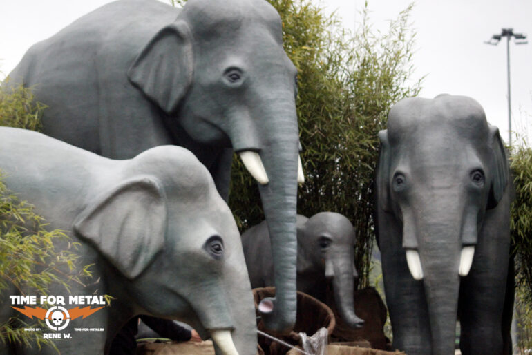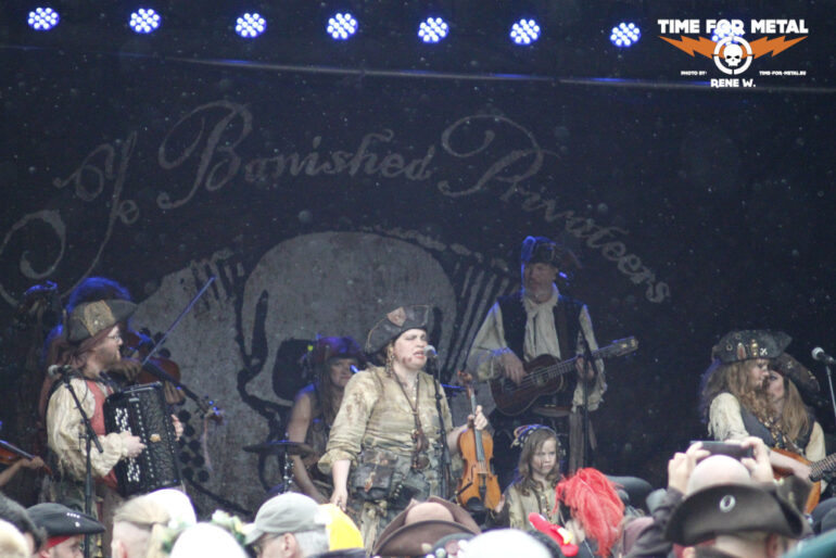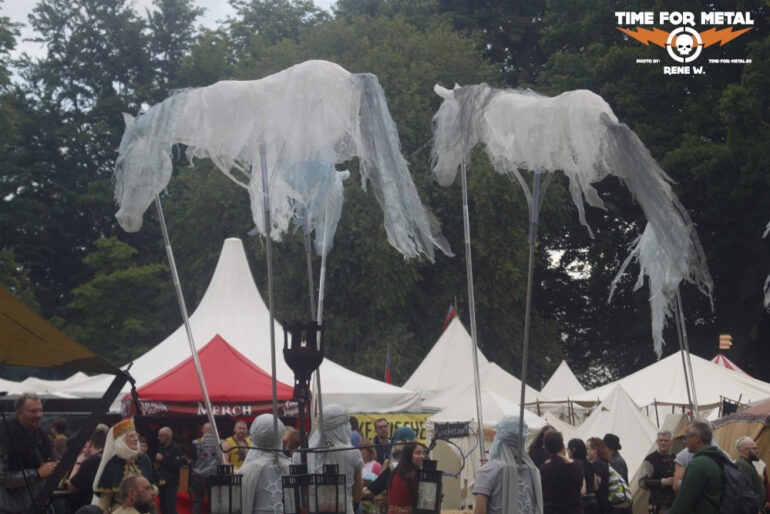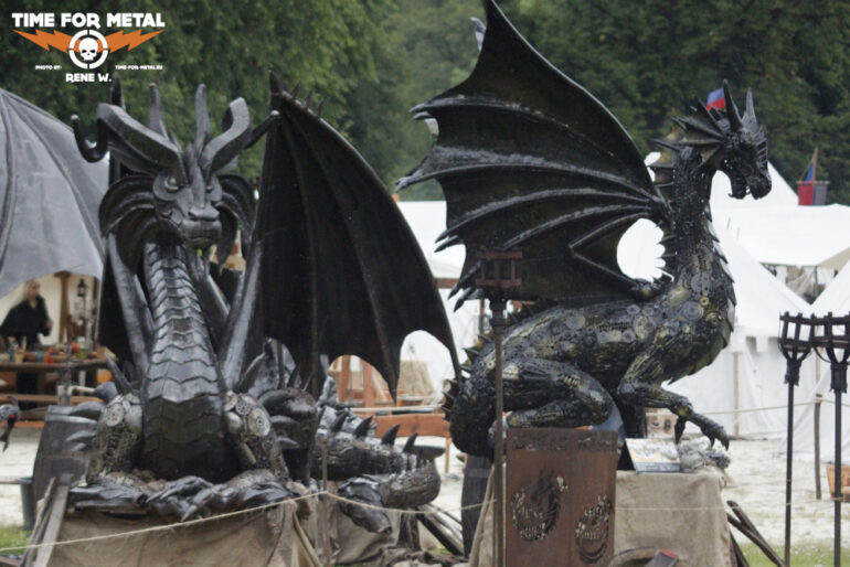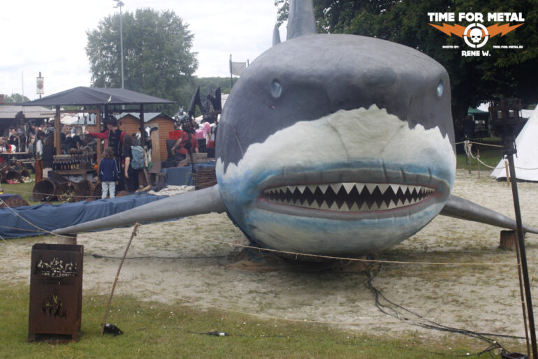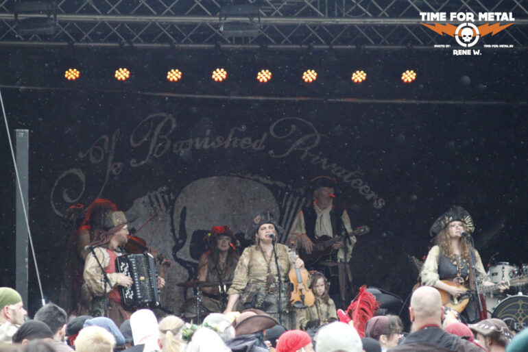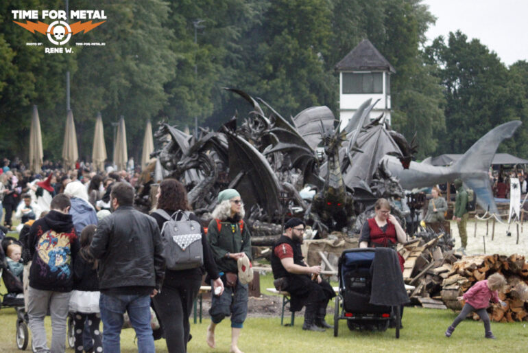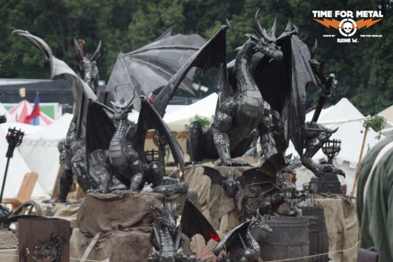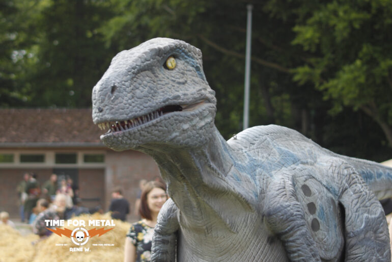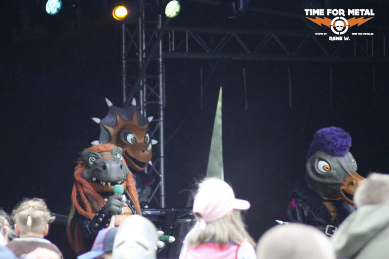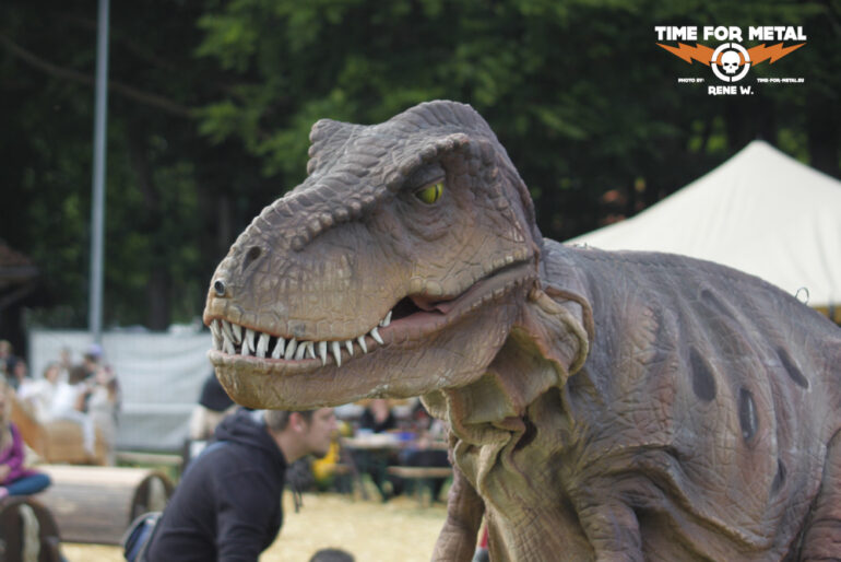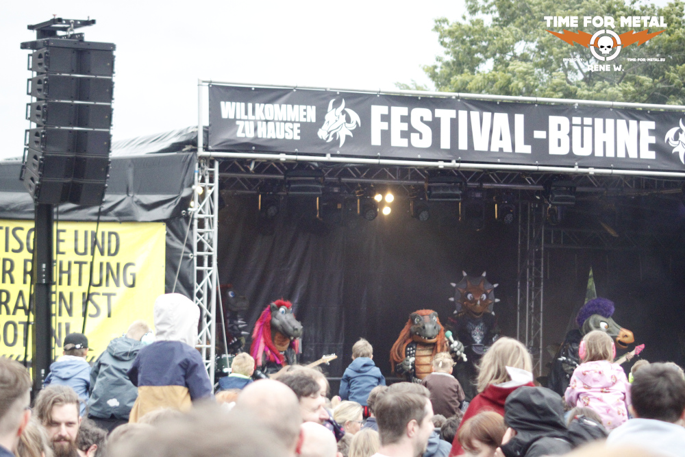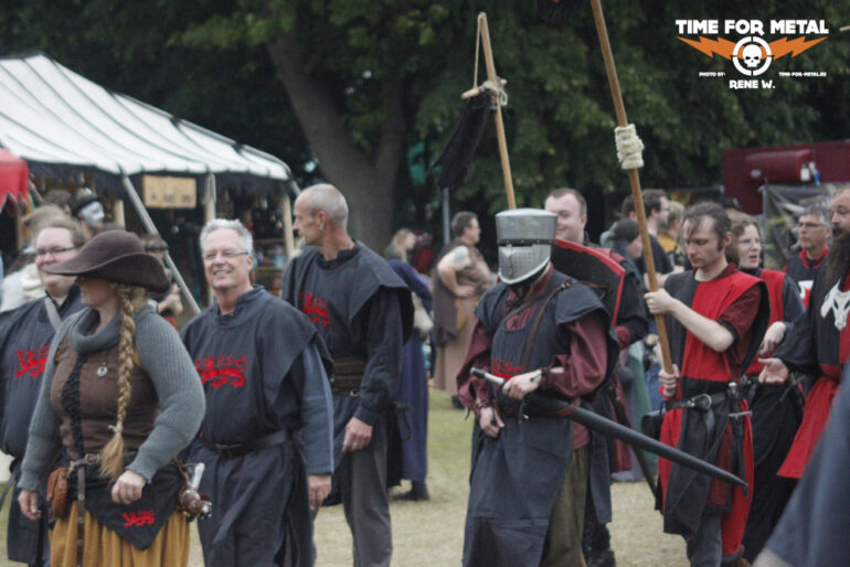 Während Ye Banished Privateers zu ihrem ersten Auftritt ansetzen, beginnt es erstmals ein wenig zu regnen. Plätze zum Unterstellen gibt es satt. Piraten, Elfen und auch Ritter sind ohnehin nicht aus Pappe und trotzen dem feinen Sprühregen. Der erste Tag lockt viele Familien nach Rastede. Das liegt unter anderem an der hochgehandelten Dino-Metal-Band Heavysaurus, die sich nicht nur in der Metalszene einen beachtlichen Status erspielt, sondern auch darüber hinaus den Weg in viele Kinderzimmer gefunden hat. Kaum verwunderlich, dass es vor der Festivalbühne früh voll wird. Mr. Heavysaurus führt seine Dino Bande an. Da darf die Dino-Disko nicht fehlen. Viele Eltern und Kinder haben bereits Konzerte der Band gesehen und wissen genau, was sie erwartet. Altersgerechtes Headbanging für Kinder mit einer großen Portion Spaß für Jung und Alt. Mit Flugsaurier heben sie ab und mit Kaugummi Ist Mega zünden sie ihren Megahit. Mit Dino-Metalheads ist nach gut einer Stunde Schluss und die Meute geht ihrer Wege. Teils zum nicht weit entfernten Bällebad oder zu einem der 60 Speisegastrostände.