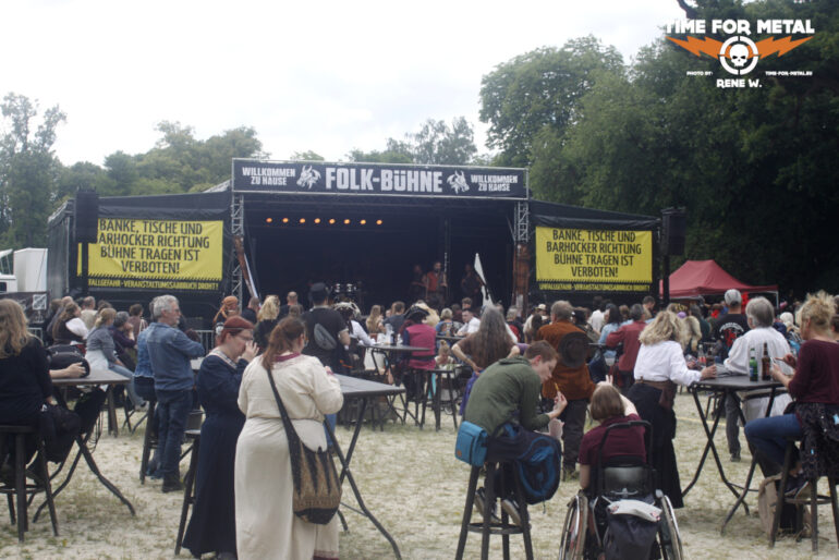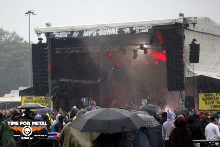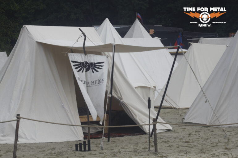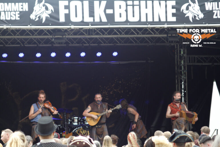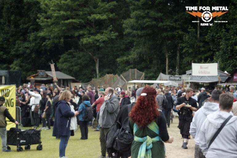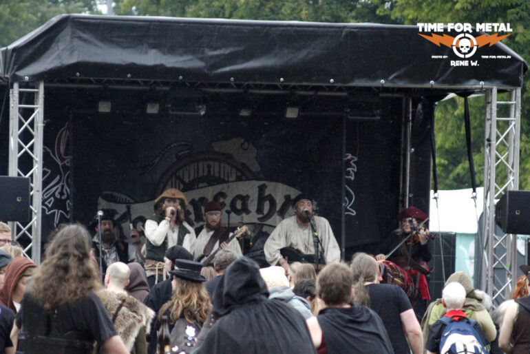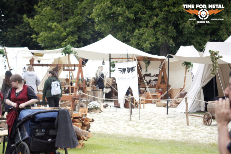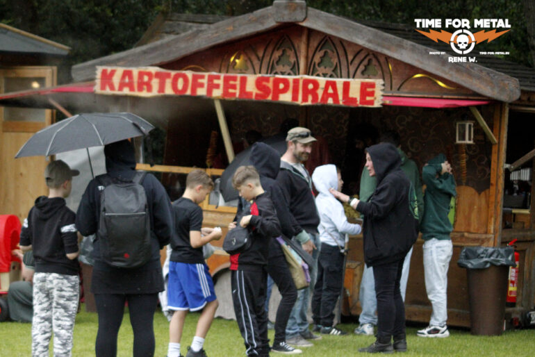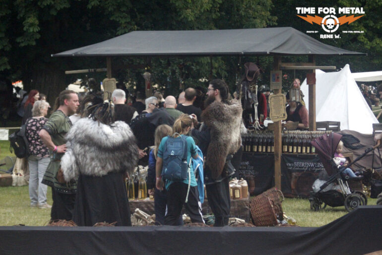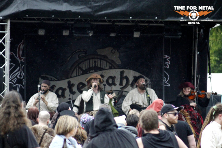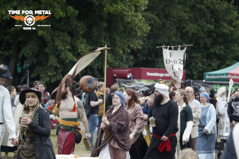 Das bunte Treiben geht auf den fünf Bühnen wild weiter. Auf der Hauptbühne warten die norddeutschen Versengold. Seit ca. 17 Uhr regnet es beständig und das Wetter scheint keinerlei Interesse zu haben, sich heute noch mal zu ändern. Die deutsche Pop-Rock- und Mittelalter-Folk-Band Versengold aus Bremen begeistert seit ihrer Gründung im Jahr 2003 Fans im ganzen Land. Mitreißende Melodien, kraftvolle Texte und ein einzigartiger Stil machen ihre Konzerte zu einem unvergesslichen Erlebnis, so auch heute in Rastede. Von 18:00 bis 20:00 Uhr zeleberieren sie ein fast 120-minütiges Set voller Energie. Ein bunter Blumenstrauß an Hits und Klassikern, sowie auch brandneue Songs wie Klabauterfrau! Sänger Malte Hoyer hat alles im Griff und gibt nach einem heißen Ritt den Staffelstab an Tanzwut weiter. Die deutsche Band kombiniert um Sänger Teufel Neue Deutsche Härte mit Mittelalter-Rock. Die Stimmung bleibt feuchtfröhlich. Bei Gerstensaft und Dauerregen stecken die Anhänger der Formation nicht den Kopf in den Sand. Die vielen Lagerfeuer werden früh angezündet und sorgen für warme wie trockene Plätze.