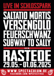 Um 20 Uhr setzen Subway To Sally ihr Zeichen. Nach dem Intro lassen sie Phönix und Wunder für sich sprechen. Die Mittelalter-Rock-Band aus Potsdam braucht keine Vorlaufzeit. Ihre Fans sind sofort da. Voller Euphorie wird die Open-Air-Zeit für die Musiker stimmungsvoll eröffnet. Morgen zieht es die Künstler nach Andernach, bis dahin gilt es für Eric Fish und seine Truppe, das Publikum in Rastede zum Kochen zu bringen. Das gelingt Bodenski, Simon und Co. spielend leicht. Ally Storch setzt an der Violine immer wieder mitreißende Höhepunkte. Das Set wird des Weiteren mit Was Ihr Wollt und Kleid Aus Rosen geformt. Ein gekonnter Mix aus älteren Werken und neuerem Liedgut. Die perfekten Medleys gehören zweifelsohne zur Liveshow. Die Kombination aus Henkersbraut / Falscher Heiland und Knochenschiff bringt den Platz vor der Bühne zum Beben. Mephisto setzt den nächsten Nadelstich in eine perfekte Open-Air-Darbietung. Passend zum 33. Bandgeburtstag springen sie weiter durch ihre Diskografie mit Das Rätsel II, Eisblumen und Veitstanz. Schluss ist dann immer noch nicht, Eric hat immer noch Lust und der Rest der Band ist topfit und gewillt, die Party weiter zum Siedepunkt zu treiben. Wenn Engel Hassen legt dem nächsten Medley vor. Gleich vier Hits werden in der Folge kombiniert. Sag Dem Teufel, Ohne Liebe, Sieben und Tanz Auf Dem Vulkan lassen keine Wünsche offen. Der Evergreen Julia Und Die Räuber setzt den Schluss.