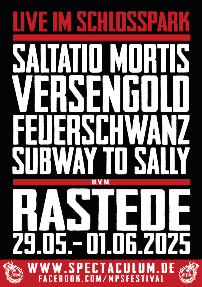 Für uns enden zwei ereignisreiche Tage und schließen unser MPS-Kapitel in Rastede in diesem Jahr. Wir freuen uns bereits auf nächstes Jahr, während viele Besucher das perfekte Wetter nutzen, um nicht nur diese genannten Bands zu feiern, sondern auch gemütlich am Lagerfeuer sitzend die vielen Getränke und Speisen zu genießen. Wirklich Schluss ist jedoch auch am Samstagabend nach der spektakulären Saltatio Mortis nicht. Am morgigen Samstag steht noch ein bärenstarkes Programm auf dem Zettel. Neben den vielen gutgelaunten Gauklern, Spielleuten, Rittern, Elfen und Sensenmännern warten auch noch Top Acts wie Harpyie, Mr. Hurley & Die Pulveraffen, Faun und Saltatio Mortis. Zudem gibt’s noch den Markt, jedoch ohne Musikarena MPS Bühne, dafür aber mit einer zweiten Heavysaurus-Show und den Senkrechtstartern von Kupfergold.