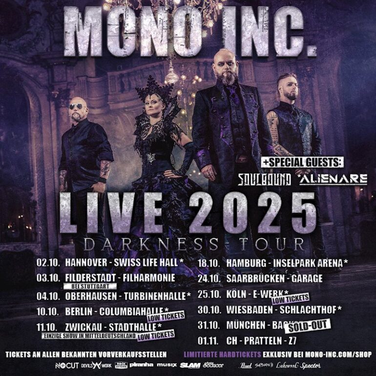 Unterstützt werden Mono Inc. von den bereits angekündigten Special Guests Soulbound – sowie neu dabei: die Synth-Pop-Shootingstars Alienare auf ausgewählten Konzerten*.