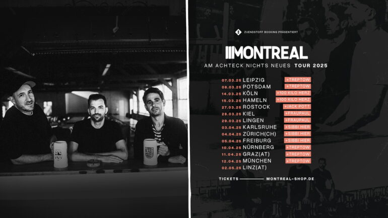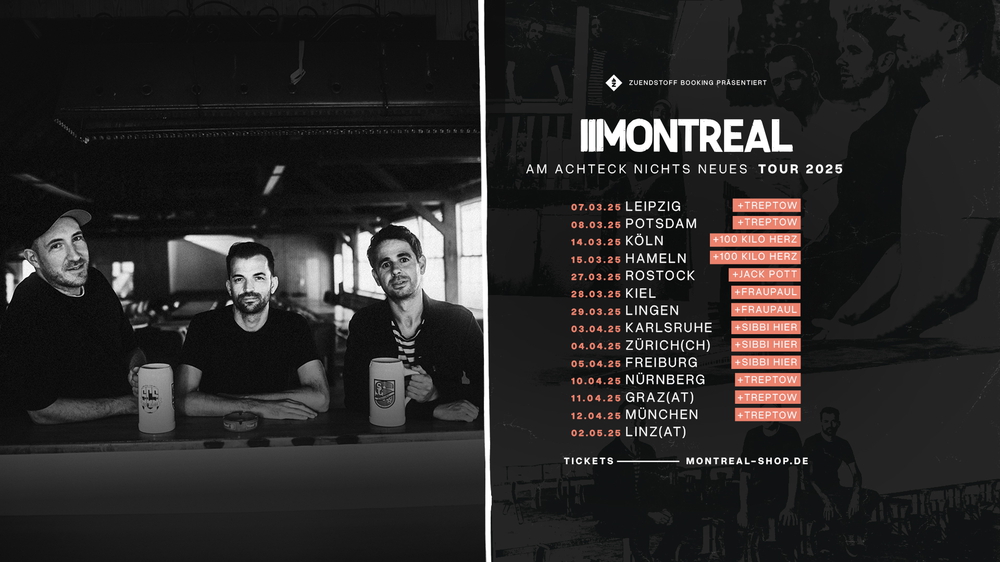 Beide Bands sind Trios, beide spielen deutschsprachigen Punkrock. Während ich die Newcomer-Mädels von FrauPaul schon mehrfach gesehen habe, sind Montreal für mich eine Premiere. Dabei besteht die Band schon seit 2003 und hat schon acht Alben und vier EPs herausgebracht. Ihr neuestes und erfolgreichstes Werk Am Achteck Nichts Neues, #Sechs der deutschen Charts, hat nun auch schon fast wieder ein Jahr auf dem Buckel. Wer sich wie ich über den Namen wundert, schaue sich nur das Cover an, dann ist alles klar. Das Achteck ist ein klassischer Bierverkaufsstand.