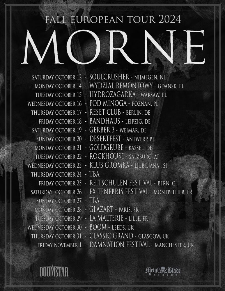 Morne aus Boston, Massachusetts, kehren im Herbst für eine fast dreiwöchige Tournee auf die Bühnen Europas und Großbritanniens zurück. Die Reise – die am 12. Oktober beginnt und bis zum 1. November dauert – beinhaltet Auftritte beim Soulcrusher Fest, Desertfest, Damnation Festival und mehr.
