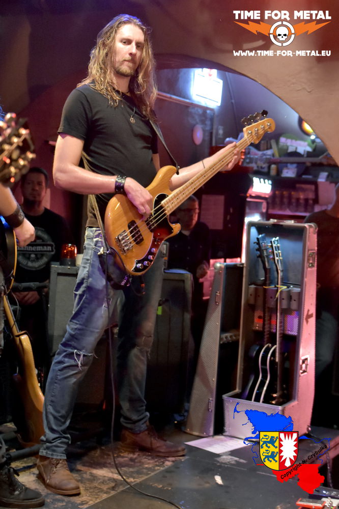 So beginnen dann Godsnake ihr Set mit Hellbound Ride. Die fünf Hamburger um Sänger Torger spielen einen harten, rifflastigen Metal, der trotz der Lautstärke einige Hooklines zu bieten hat. Drummer Sidney wütet an seinem Kit und Carsten am Bass untermauert die kräftigen Beats mit seinem akzentuierten Spiel. Beide Gitarreros schenken sich nichts. Malte ist der etwas sololastigere, wobei auch Stefan seine Momente hat. Sie spielen fast alle die Songs ihrer 4 Track EP, die aber zum Entstehungsdatum noch vom Gitarristen eingesungen wurde. Wer sich das Teil mal antut, der wird eine verdammte Ähnlichkeit mit James Hettfield feststellen können. Beachtenswert ist auch, dass die Truppe bereits 2016 auf den Hamburger Metal Dayz aufgetreten ist. So wissen die sechs Tracks, davon drei neue, zu gefallen. Der Aufforderung, die Bambi Galore leerzusaufen, kommen einige sehr gern nach, wie sich später noch zeigen wird. Der Platz vor der Bühne ist noch luftig, und so beenden die göttlichen Schlangen nach 30 Minuten ihren Auftritt. Das war schon mal ein guter Anfang.