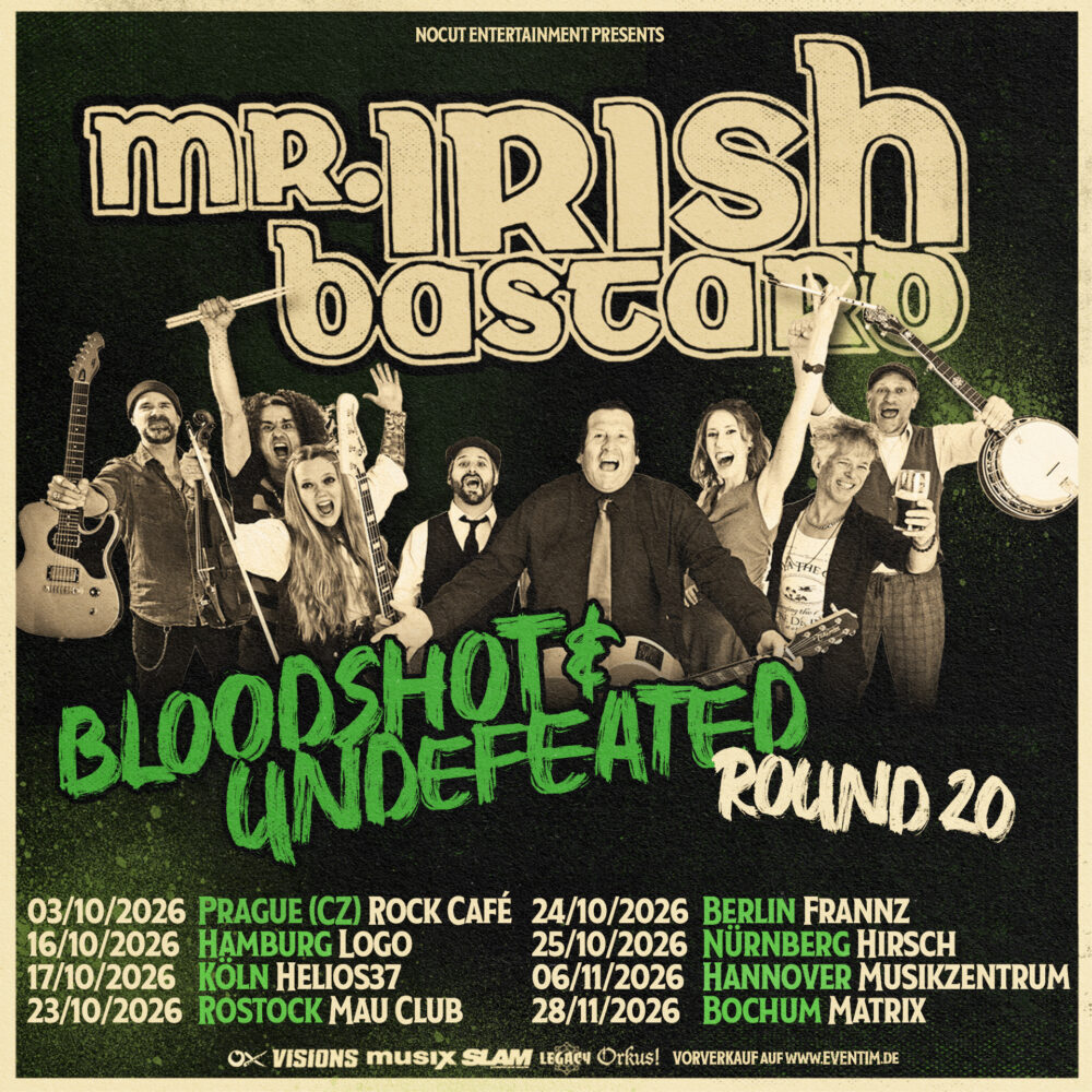 Eine energiegeladene, persönliche und augenzwinkernde Show – mit einem kleinen Rückblick, aber voller Vorfreude auf das, was kommt. Die Bloodshot & Undefeated Tour führt Mr. Irish Bastard im Oktober und November 2026 nach Prag, Hamburg, Köln, Rostock, Berlin, Nürnberg, Hannover und Bochum. Denn, wie es die Dubliners schon sagten: „It’s too late to stop now.“