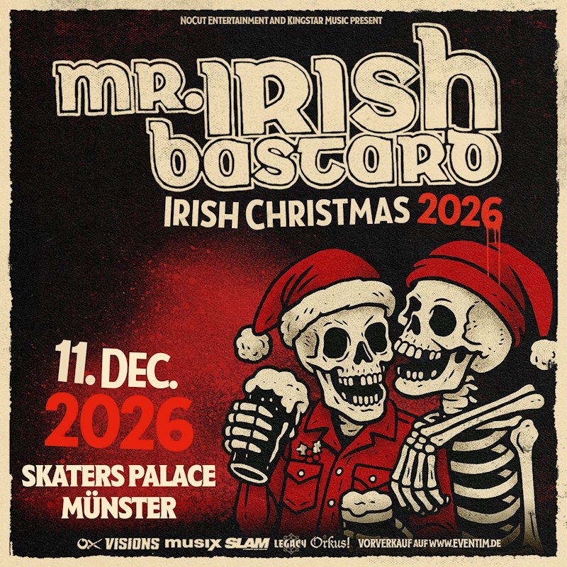 Nach dem Wahnsinn von 2025 kehrt die Band am 11.12.2026 zurück ins Skaters Palace Münster. Laut, herzlich, schweißtreibend – mit treibendem Folk-Punk, irischem Charme, festlicher Stimmung und einer ordentlichen Portion Heimatgefühl. Ein Abend zum Mitsingen, Anstoßen und Gemeinsam-Feiern. Irish Christmas, wie es sein muss.