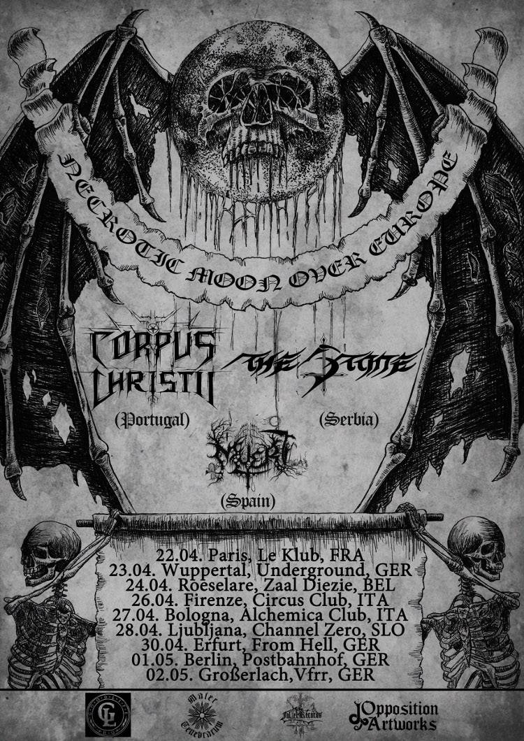 CORPUS CHRISTII (Black Metal) und THE STONE (Black Metal) haben sich für eine Doppel-Headliner-Tour im Frühling 2015 zusammengetan. Die Tour wird vom 22. April bis zum 2. Mai gehen. Beide Kultbands werden dabei ihre brandneuen Alben im Gepäck haben. THE STONE ihr siebtes Monster „Nekroza“, das am 01. Oktober 2014 via Folter Records erschienen ist und CORPUS CHIRSTII nach vier Jahren der Stille ihr achtes Album „Palemoon“, das im März 2015 via Folter Records veröffentlich wurde. Das Tourgespann wird durch die spanische Black-Metal-Band MUERT komplettiert.
