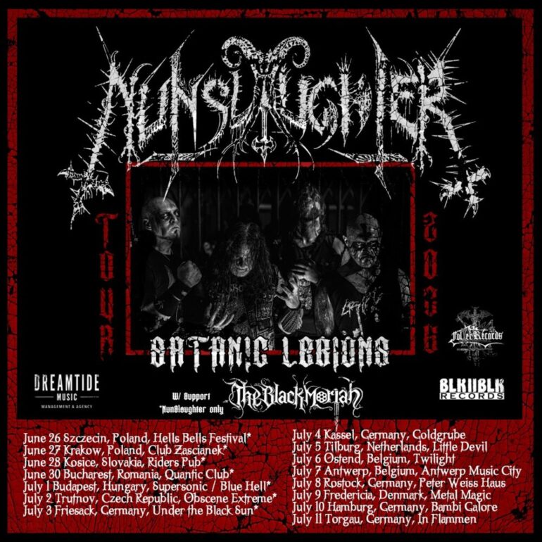 Die Extreme-Metal-Veteranen aus Cleveland kehren 2026 nach Europa zurück. Nach weltweiten Festivalauftritten und Shows unter anderem mit Acid Bath schlagen Nunslaughter mit der Satanic Legions Tour 2026 erneut auf dem europäischen Kontinent auf.