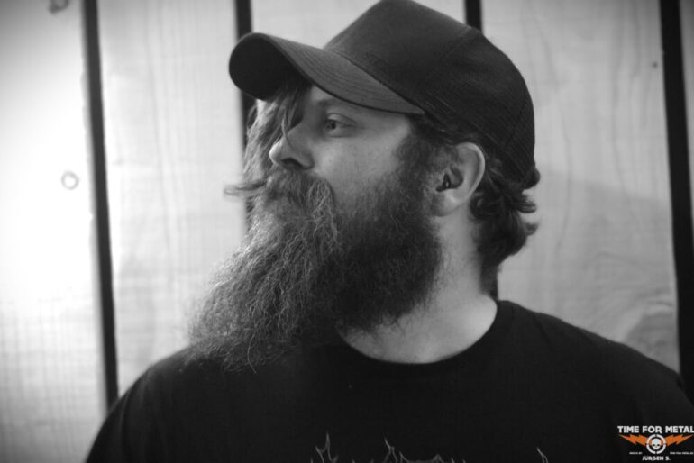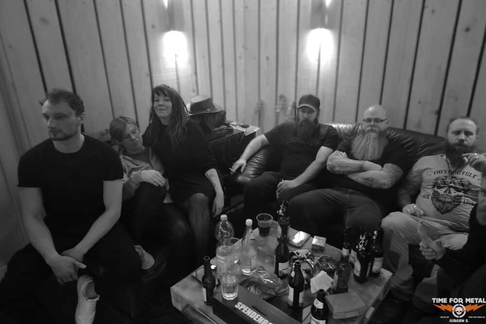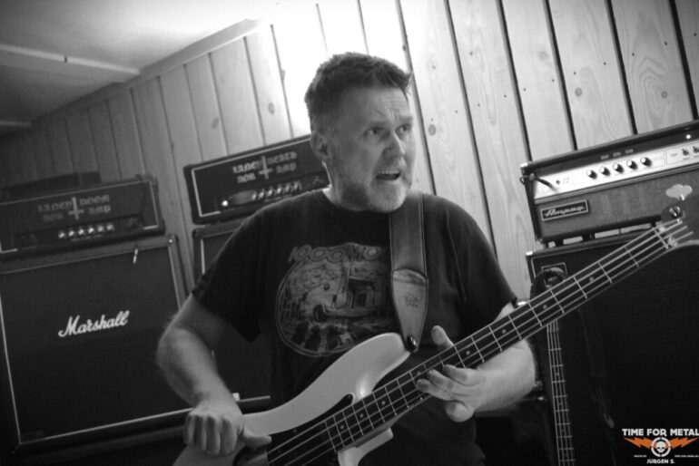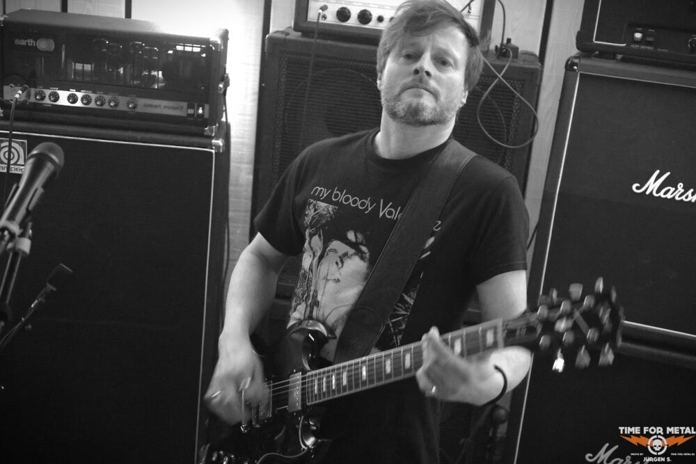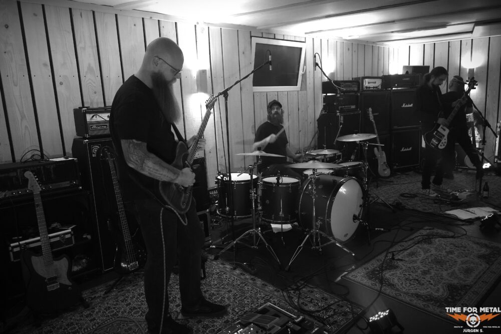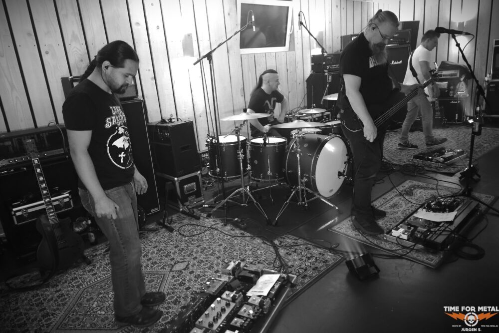 Jetzt wird es roh, laut und verdammt heavy: Mudfinger lassen als erste Band ihren Proberaum erbeben und zeigen eindrucksvoll, warum sie sich im Westerwald und darüber hinaus einen Namen gemacht haben. Der Sound ist dreckig, wuchtig und tief in der Stoner-Ecke verankert, mit genau der richtigen Portion Sludge, die alles noch schwerer und schleppender wirken lässt. Mudfinger stehen hier als eingespieltes Quartett auf der Bühne – Oli treibt die Songs mit seinem kraftvollen Schlagzeug gnadenlos nach vorne, während Marcus am Bass und Mikrofon das Geschehen kontrolliert. Zwischen den Songs greift er wie gewohnt zum Bier, tauscht ein paar Worte mit den Anwesenden und sorgt so für eine angenehm lockere, familiäre Atmosphäre. An den Gitarren liefern Jeff und Timo das massive Riff-Fundament. Jeff trägt heute seine Haare mal nicht offen (wie so oft bei Konzerten), sondern er hat seine Haare zu einem Zopf gebunden, der fast bis zum Boden reicht – Rapunzel lässt grüßen. Optisch wie musikalisch ist das ein markanter Auftritt, der perfekt zum schweren Sound der Band passt.