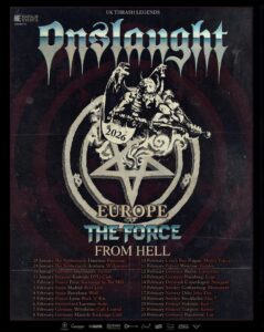 Onslaught äußern sich zur bevorstehenden Tour: “So looking forward to this one following on from the great success of the Power From Hell Tour earlier this year… it’s gonna be a full on combination of the best of Power From Hell with The Force (40th Anniversary) to create a totally monstrous set for those who we missed out last time.. Let there be Thrash – See you in the Pit..!!”