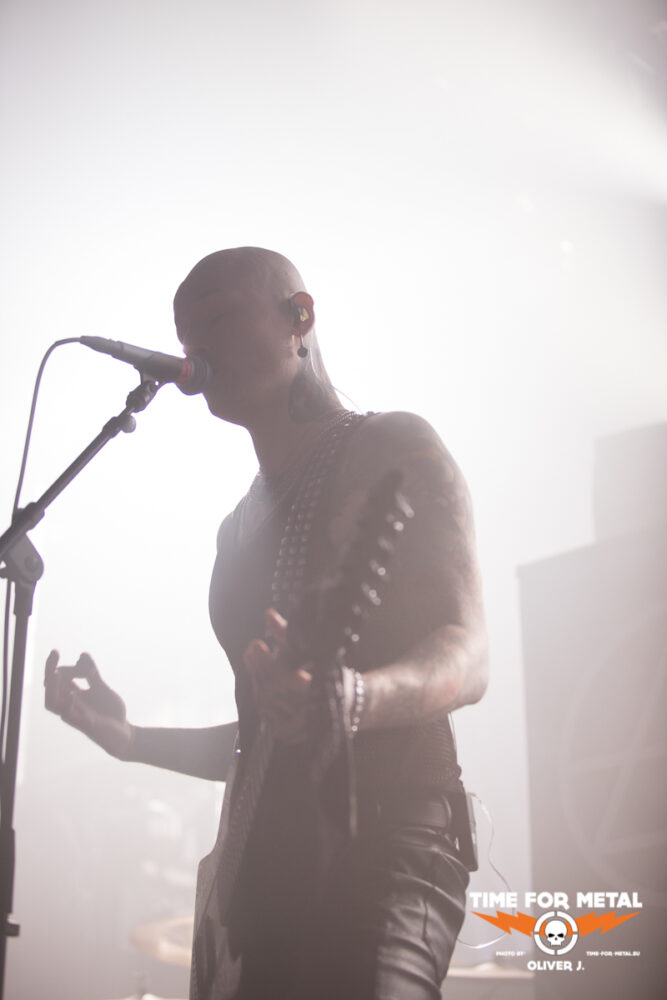 Los geht es mit Atlas, irgendwo habe ich etwas von 19 Uhr Beginn gelesen, aber dann geht es doch eine halbe Stunde eher los. Und nicht nur ich bin überrascht, auch das umstehende Publikum ist etwas verwirrt. Die Jungs von Atlas kommen aus Finnland und zaubern aus meiner Sicht irgendwie modernen Gothic Metal aus den Lautsprechern, eine Assoziation, die sicherlich auch von den schwarzen Rosenranken am Mikroständer unterstützt wird. Sie selbst beschreiben ihre Musik als „Northcore“, in der sie sich an der finnischen Mythologie bedienen. Ich selbst habe von den Jungs bislang nur den Namen gehört, das sieht bei den Fans in den ersten Reihen aber ganz anders aus. Dort wird fleißig und textsicher mitgesungen. Leider kann man von den Herren nicht wirklich viel erkennen, denn Atlas nebeln der Batschkapp ordentlich ein. Irgendwie wird das Thema „sehen“ im Laufe des Abends allgemein eher überbewertet. Etwas schmunzeln muss ich, als die Band sich eine Wall of Death wünscht, die dann doch etwas sehr dürftig ausfällt – das wird man im Laufe des Abends noch anders erleben.