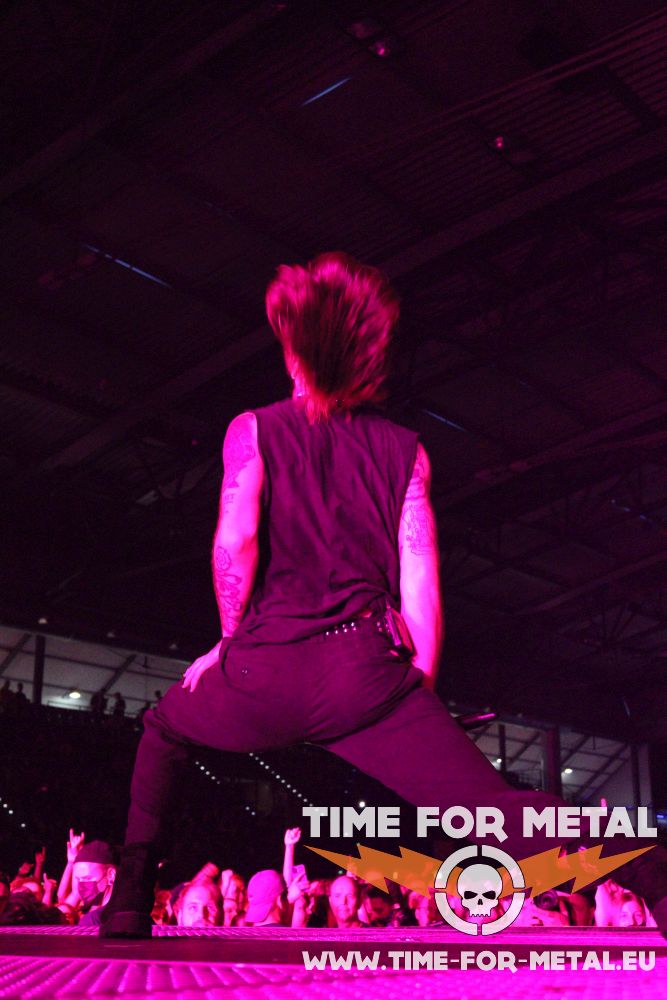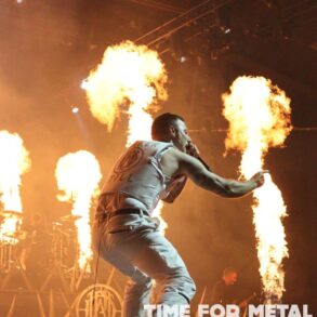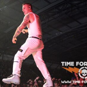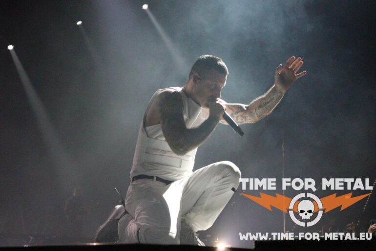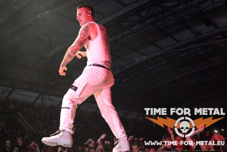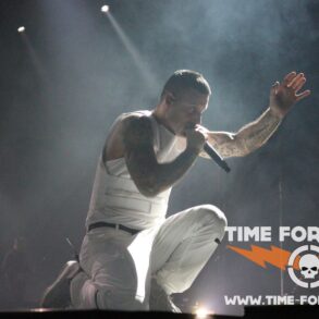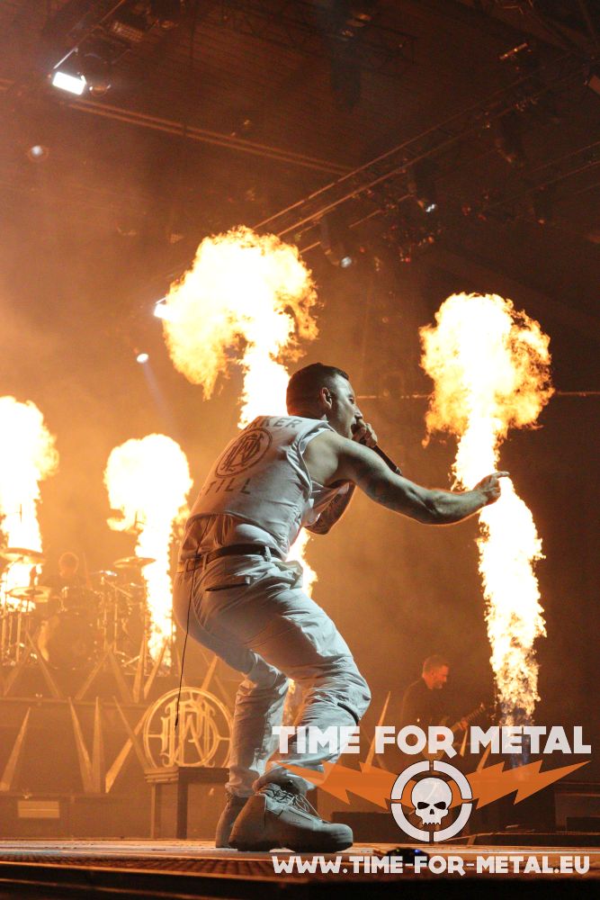 Erwartungsvoll sind jetzt die Augen auf die Bühne gerichtet, diese wird gleich noch ein Stück erweitert und Parkway Drive inszenieren gegen 20:35 Uhr gekonnt mit einer Lichtprojektion des neuen Albums Darker Still und Flammenträgern ihren Einzug. Winston McCall, ganz in Weiß gekleidet, eröffnet das Set mit dem aktuellen Reißer Glitch und ein paar Feuersalven und setzt den Klassiker Prey hinterher. “In einer verrückten Welt sollen alle mehr zusammenhalten” fordert er die Fans auf und natürlich zum “Spaß haben, singen, tanzen, Crowdsurfen –auf was immer ihr Lust habt”. Den Worten des Frontmanns folgen dann auch Taten und es geht heiß her in der Leipziger Quarterback Immobilien Arena und die Securitys haben alle Hände voll zu tun mit den crowdsurffreudigen Fans.