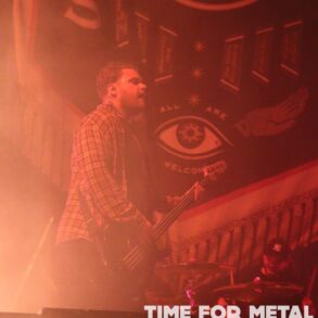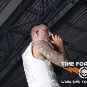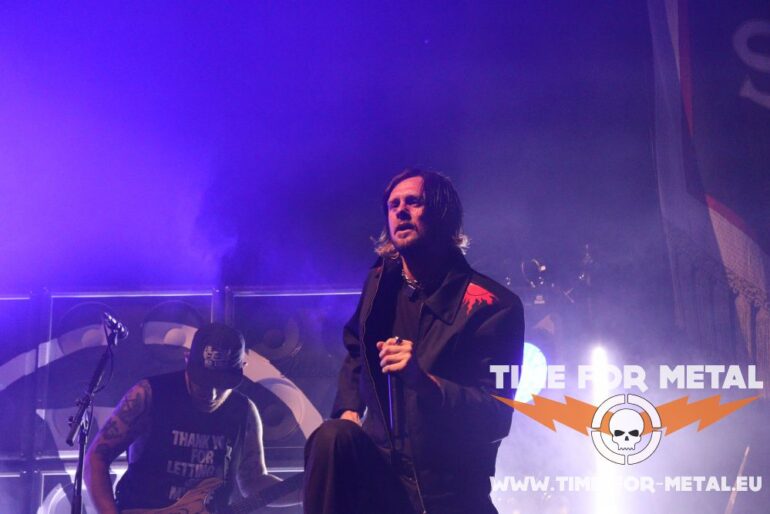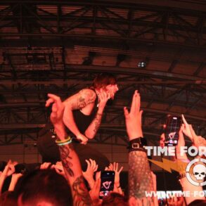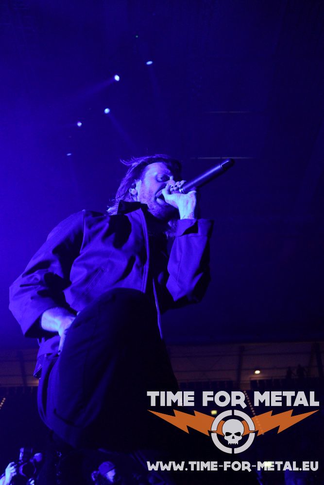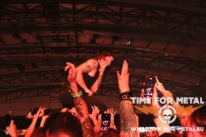 Gegen 19:20 Uhr entert die britische Hardcore Band While She Sleeps die Bühne. Zur großen Freude der pogo- und tanzfreudigen Menge, die von Anfang an mit der Band mitgeht und im Pit und beim Crowdsurfen alles gibt. Aber nicht nur sie – auch Sänger Lawrence “Loz” Taylor tanzt und hüpft die laufstegähnliche Bühne rauf und runter und genießt ein “Crowdsurfingbad” in der Menge.