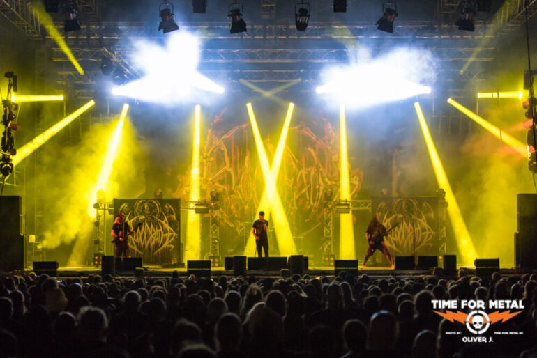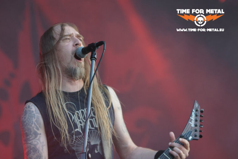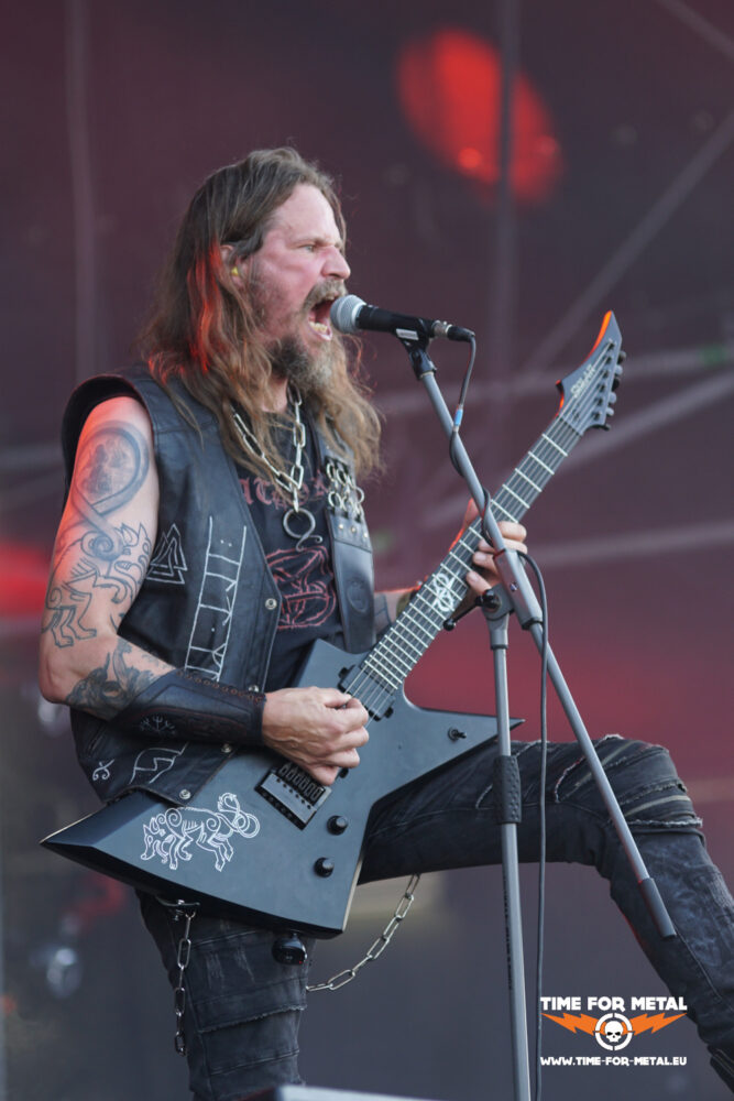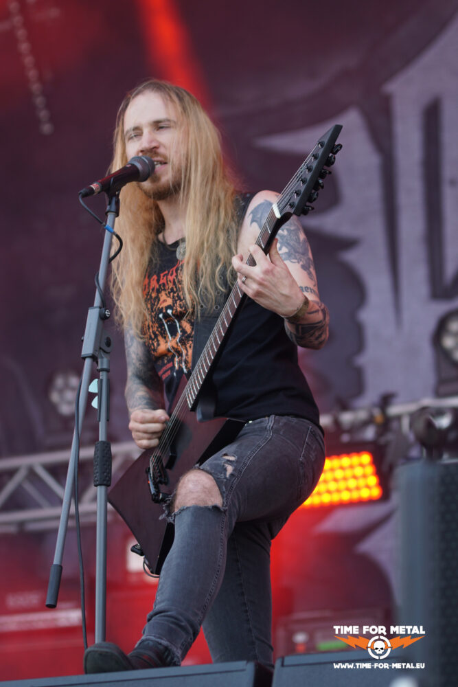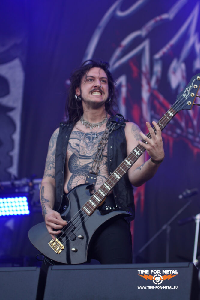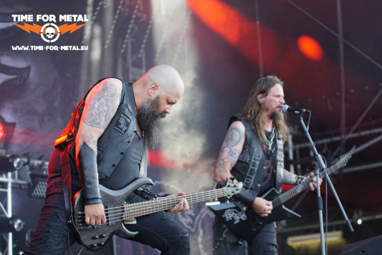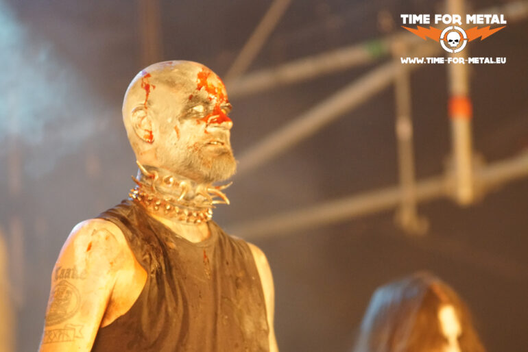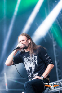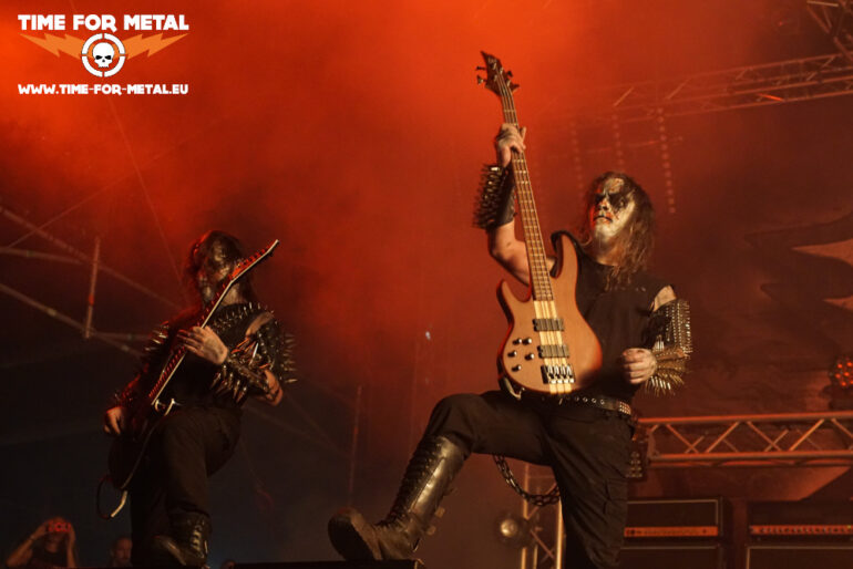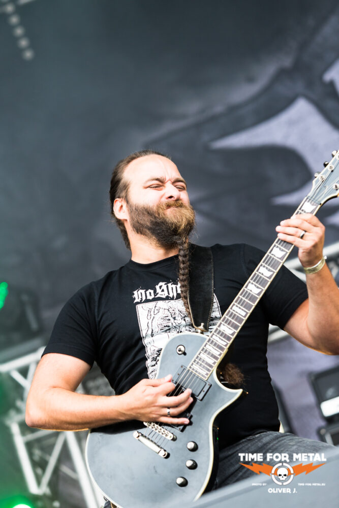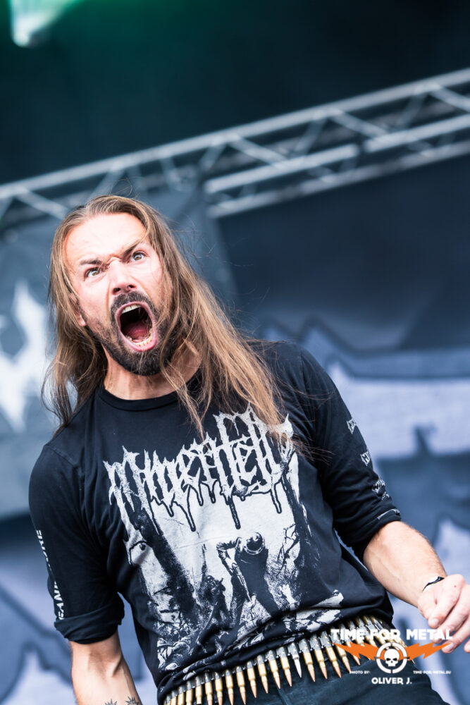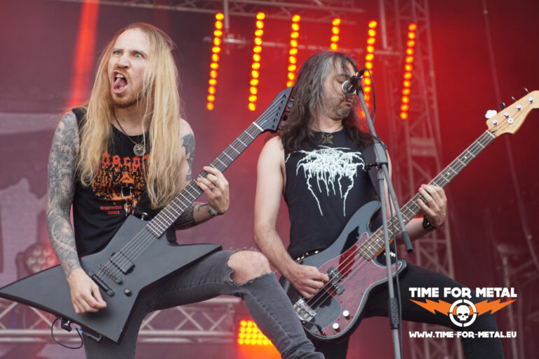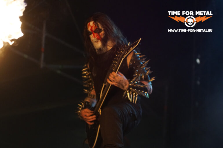 Markus P.: Eigentlich kann ich dem Black Metal nicht ganz so besonders viel abgewinnen, wenn er sich hauptsächlich im Grim’n’Frostbitten-Fahrwasser bewegt, aber bei den Franzosen Necrowretch läuft’s eine Spur anders. Auch wenn die Schwarzwurzelanteile auch an diesem Nachmittag spürbar sehr hoch sind, ist mit viel Fantasie der behauptete Death-Metal-Anteil heraushörbar. Und als Liebhaber der alten Schule bekomme ich selbstverständlich auch die Heavy-Rock-Anleihen während mancher Soli deutlich mit. Klar, die schwarzen Hassbratzen überwiegen bei dem Quartett, die ihr dreckig-fieses Material kartätschengleich aufs leider recht dünn gesäte Publikum abfeuern. Ich nehme aber mal an, dass die meisten Festivalbesucher gerade damit beschäftigt sind, weniger hitzedurchflutete, schattige Plätzchen zu suchen; die Band wird temperaturtechnisch durch den hohen Einsatz der Flame Jets auch nicht gerade schonend behandelt. Respekt an alle, die bei diesen Temperaturen eisenhart vor der Bühne ausharren. Aber besser so als Nässe von oben, ne?