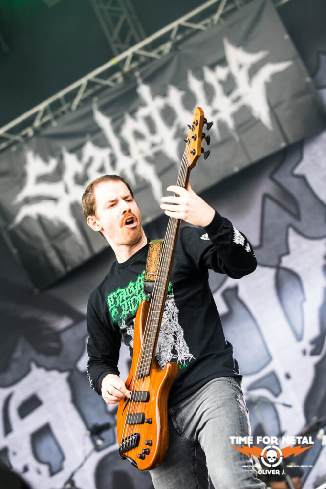 René W.: Der letzte Opener ist das Death-Metal-Schlachtschiff Scalpture. Vor vier Jahren in Ostwestfalen die Anker gelichtet, bekommt man die Truppe nicht mehr zum Stehen. Auf Platte gut und live noch besser, zeigen sie sich gewohnt agil. Trotz der frühen Stunde lassen sie keine Müdigkeit aufkommen. Im Fokus steht das neue Album Landkrieg. Die Songs des Silberlings kreisen um den 30-jährigen Krieg, der die deutschen Lande von 1618 bis 1648 verwüstete. The Fall und Into Catastrophe eben nicht nur den Weg in den Longplayer, sondern auch in diese Schlacht. Schwedentrunk lässt nicht lange auf sich warten. Frontmann Thorsten Pieper ist Feuer und Flamme. Die Lyrics werden wütend in die Menge getragen. Weniger los als beim Grindcore-Freitag, brauchen sich die Männer aus Bielefeld nicht über mangelndes Interesse beschweren. Hail Of Bullets und Asphyx-Einflüsse werden modern veredelt und finden dankbare Abnehmer. Till Jeret Undergang und Flattened Horizons (Pounding Howitzers) setzen die letzten Nadelstiche.