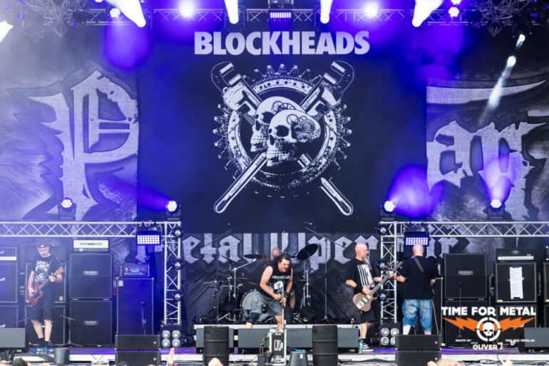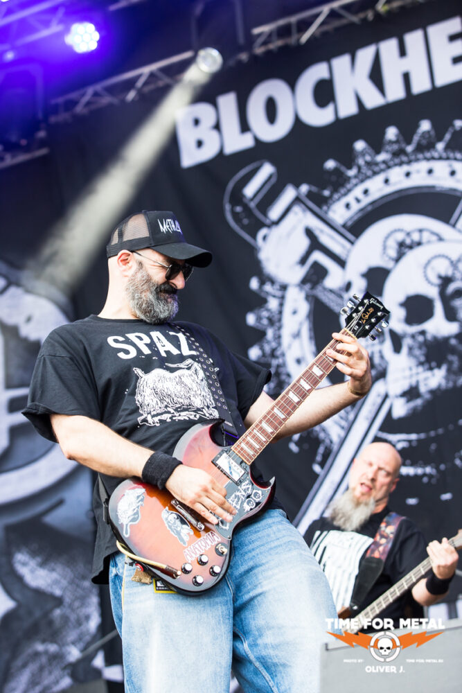 Die Franzosen Blockheads greifen nach den Grindcore-Death-Sternen und lassen leichte Napalm-Death-Muskeln spielen. Das Mikrofon von Xav baumelt überall herum. Das Kabel wickelt er sich unter anderem um den Hals, während er Face Yourself, Make Up Your Mind herausbrüllt. Die Vocals werden regelrecht herausgekotzt. Kompromisslos, brutal, deftig und gar bekommt man Follow The Bombs oder Arrogant Piece Of Shit serviert. Mit diversen Tracks pflügen sie durch die 45 Minuten. Schweißtreibend, bei guten 30 Grad, läuft schnell das Wasser vom Gesicht. Bei gutem Sound dringen die brutalen wie monotonen Kompositionen aus der Anlage. Sell Your Flesh lässt das Grindcore Bein schwingen, zum Tänzchen regt auch Black Heaps Of Cinders an. Auf der Landebahn wird man von der Sommersonne gut gegrillt. Ganz sicher auch der Grund, dass viele noch bevorzugen, Schattenplätze aufzusuchen.