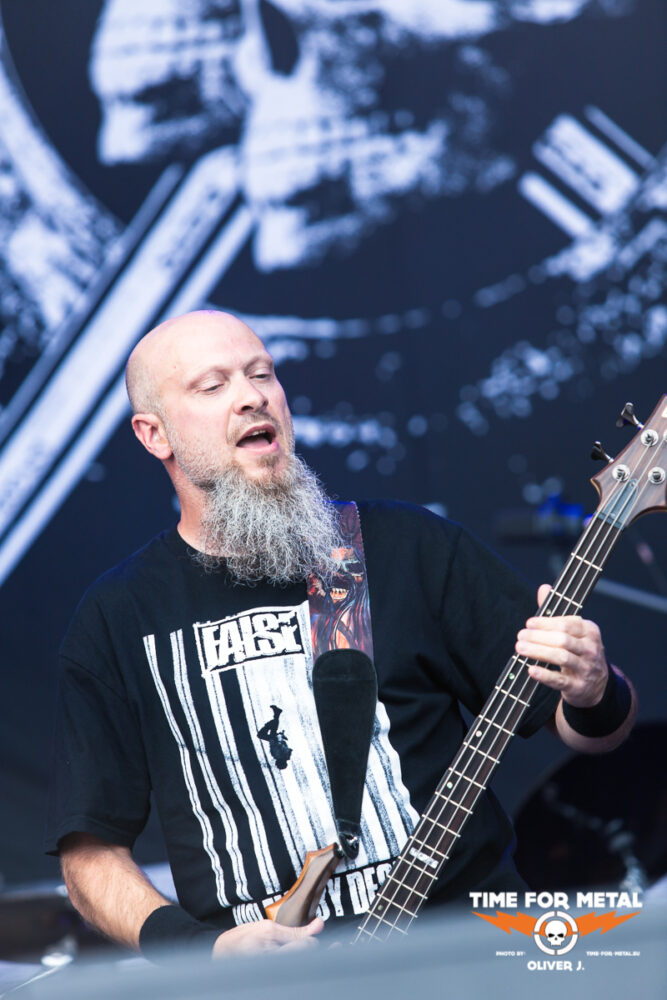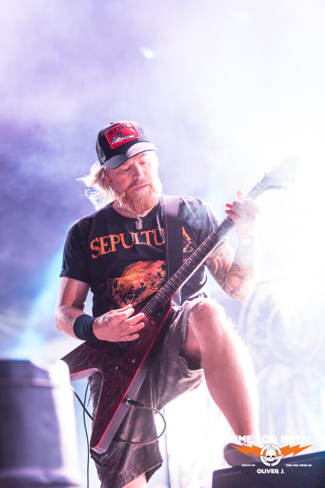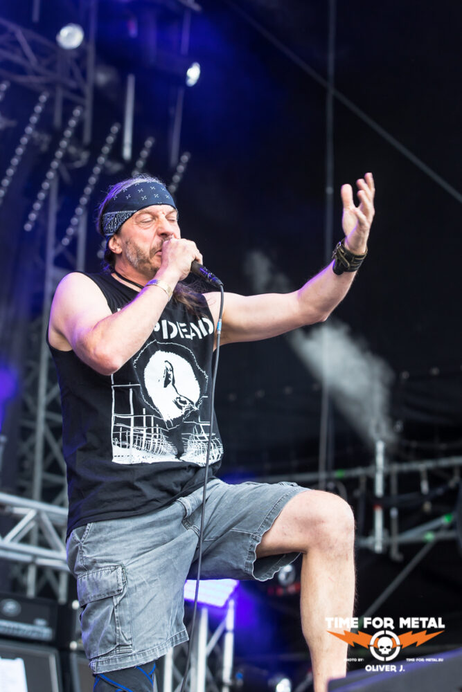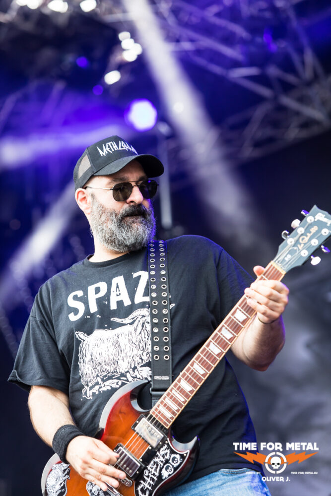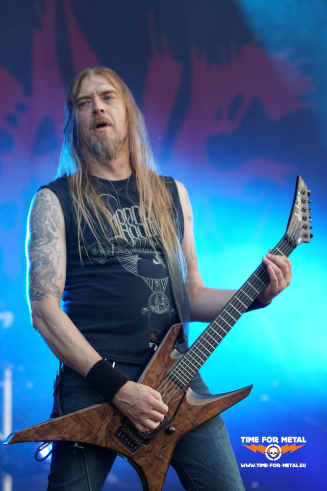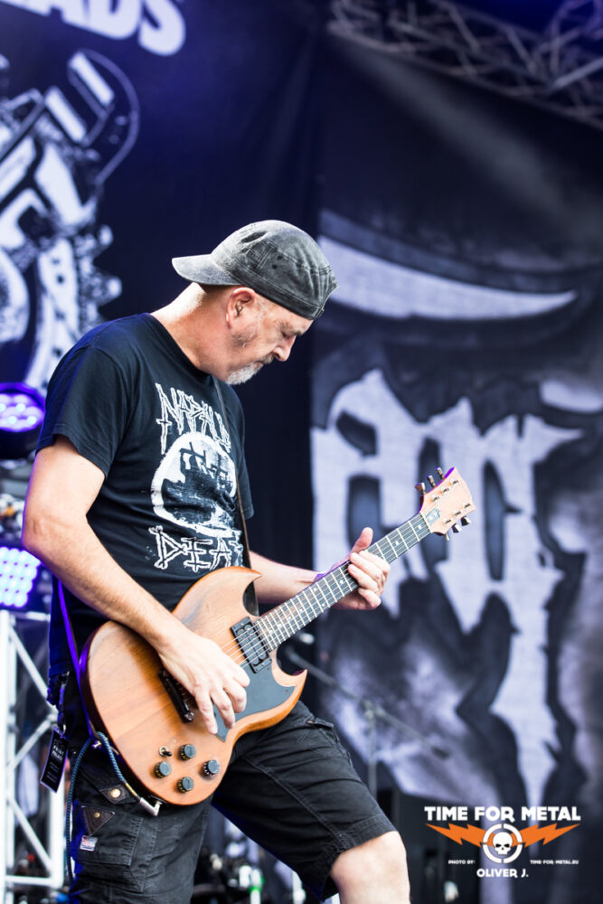 René W.: Das Ende naht. Das Grab ist ausgehoben und die Himmelspforte, so Gott will, ruft. Für die Musiker von Grave wird diese wohl noch mit zusätzlichen Brettern verrammelt. Ola Lindgren würde dort eh eine komische Figur abgeben. Zumal wir ihn noch brauchen, um heute ein spezielles Set aus Into The Grave, You’ll Never See und Soulless Material zu zelebrieren. Into The Grave und Day Of Mourning sprengen sofort alle Fesseln. Turning Black bricht über das Publikum herein und einzelne Crowdsurfer werfen sich in die Arme ihrer Träger. Das alte Material, bekommt das nötige gallige Klangbild. Old Fucking School können Tobias Christianson und Mika Lagrén. Seit zehn Jahren, oder besser gesagt, nach Out Of Respect For The Dead lässt Ola Lindgren auf neues Material warten. Das benötigen Grave ohnehin nicht. Die Tracklist wird ihnen wortwörtlich aus den Händen gefressen. Warum noch neues Liedgut produzieren? For Your God reißt religiöse Narben auf. Soulless lässt der verdorbenen Seele freien Lauf und …And Here I Die…Satisfied drückt den dreckigen Finger in die eiternde wie pulsierende Wunde. Grave liefern standesgemäß ab und hinterlassen zufriedene Gesichter.
