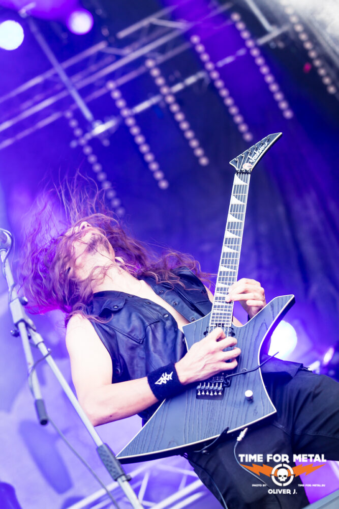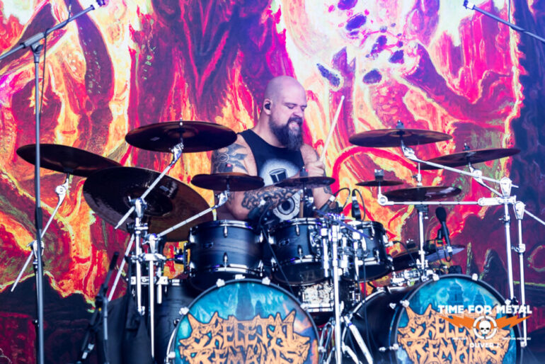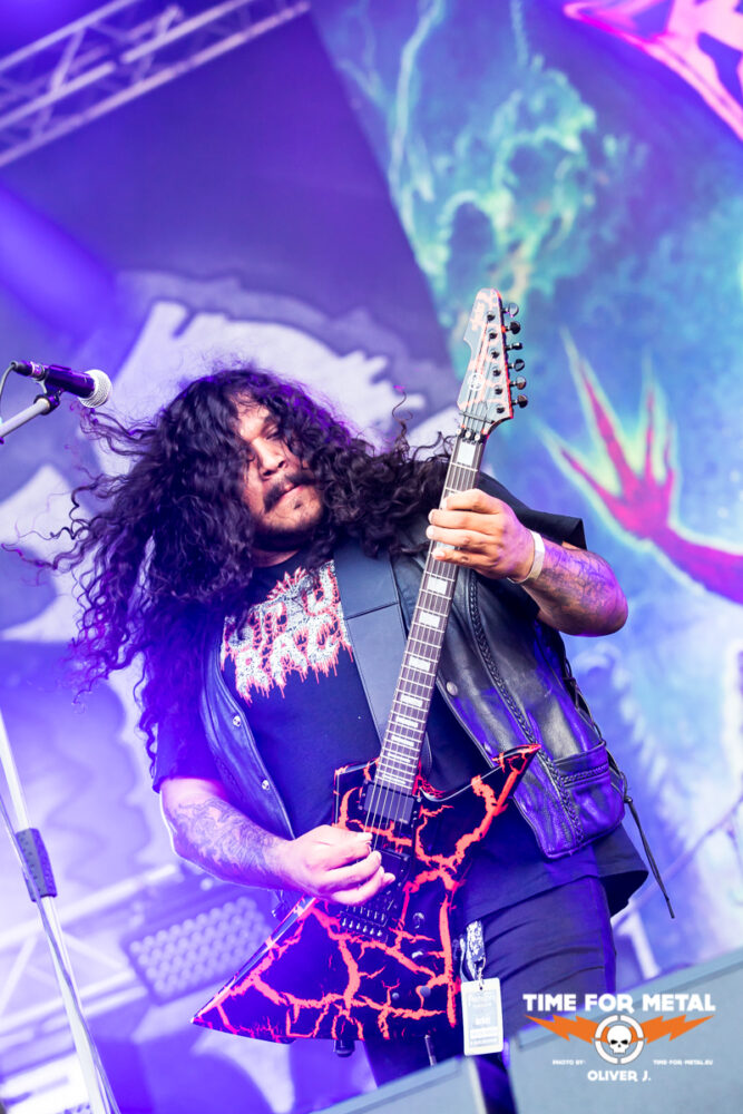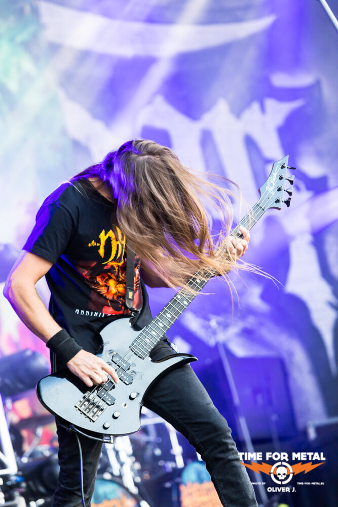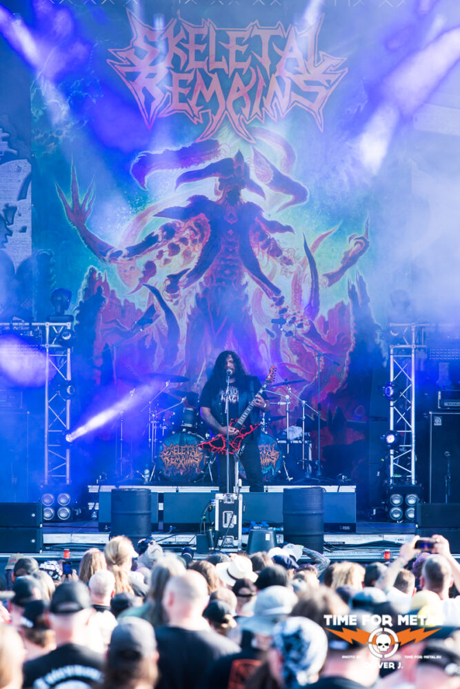 Die Kalifornier Skeletal Remains durfte ich dieses Jahr schon einmal auf dem deutlich kleineren Chronical Moshers Open Air in recht familiärer und intimer Atmosphäre erleben. Auch auf dem Party.San Metal Open Air sind Chris Monroy und seine Livemannschaft aber keine ganz Unbekannten mehr, auch wenn ihr damaliger Auftritt mittlerweile bereits zwölf Jahre her ist; auf der großen Main Stage liefern die Amis auch heute wieder eine saugeile, routinierte Bühnenshow ab, in manchen Momenten wirkt es aber leider etwas gelangweilt und zu meinem Leidwesen hat die Band die thrashenden Parts deutlich zugunsten richtig harter Death-Riffs zurückgefahren. Nicht, dass ich das jetzt wirklich schlecht finden würde, götterbewahre! Aber damit fehlen mir auch die eher melodischen Einschübe etwas. Die deutlich hervorstechenden Triolenritte beim Drumming stimmen mich dann allerdings wieder glücklich. Und als dann der Schluss zum speedlastigen Gewaltritt gerät, bin ich mit mir und der Band endgültig wieder im Reinen.