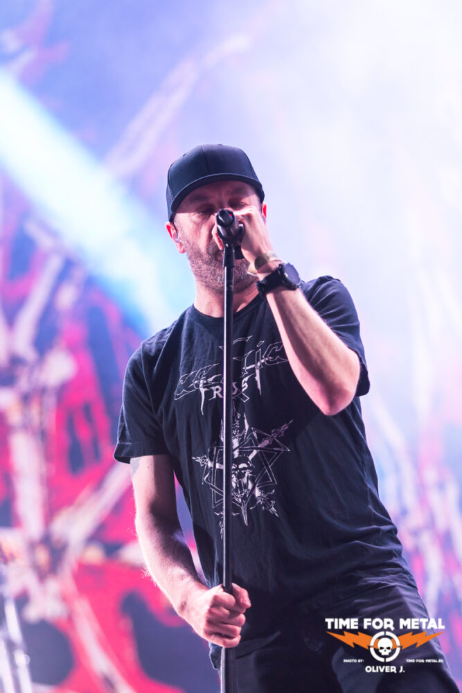 Tiamat-Sänger und Mastermind Johan Edlund ist sichtbar alt geworden. Der 54 Jahre alte Künstler wirkt wie ein Greis. Was ist in den letzten Jahren mit ihm passiert? Optisch ähnlich schockierend wie Ville Valo, gesanglich dazu auf ähnlichen Wegen wie Axl Rose. Johan so zu sehen und zu hören, tut weh. Den ersten Schock nach In A Dream und Clouds verdaut, weiß man die Show nur schwer einzuordnen. Ein Verkehrsunfall, bei dem man nicht wegschauen kann, trifft es wohl am deutlichsten. Mit Kopfbedeckung und Sonnenbrille wankt Johan Edlund durch den Ring. Technisch ist Tiamat mit einer jungen Truppe stark unterwegs. Die Blicke bleiben trotzdem permanent beim Frontmann kleben. Die ansprechende Setlist wird schnell zur Nebensache. Das Charisma von A Caress Of Stars und The Sleeping Beauty springt nur zaghaft auf das Publikum über. Nach 35 Minuten benötigt Johann eine kleine Stärkung und verlässt dafür die Bühne. Die skurrile Show gipfelt in Küssen für seine Mitstreiter. Wild fuchtelnd wird über die Bühne stolziert, um den Hit Vote For Love anzustimmen. Die dunklen Klänge rauschen an einem vorbei und die Probleme an den Gitarren werden nur noch achselzuckend zur Kenntnis genommen. Gaia klappt das Tiamat-Kapitel auf dem Party.San zu und man darf auf die Performance bei der Tour im Dezember in Südamerika gespannt sein.