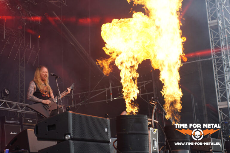 René W.: Fairerweise muss man feststellen, dass Bloodbath nicht der gewünschte Headliner bei allen Party.San Besuchern ist. Der letzte Auftritt vor ein paar Jahren war okay, hat jedoch keine unbändige Euphorie erzeugt. Mit dieser Lockerheit kann man ganz bequem Platz vor der Bühne einnehmen, um den letzten Act zu genießen. Was sofort auffällt: Nick Holmes ist viel agiler als bei der letzten Show von vor sechs Jahren. So You Die zum Start ist ein cooler Move, damit können die Schweden nur gewinnen. Zudem folgt recht früh Breeding Death. Die Flammen züngeln gen Himmel. Eine angenehme Sommernacht macht sich breit und beschert hohe Temperaturen zur späten Stunde. Like Fire unterstreicht zur Geisterstunde den Spuk. Feuerbälle erhellen Schlotheim, bis das Tor zur Hölle bis zum nächsten August wieder schließt. Brave New Hell hält den Fuß in der Tür, noch haben Bloodbath 20 Minuten. Let The Stillborn Come To Me lässt die Schatten länger werden. Nick ist blendend aufgelegt und gehört zu den PSOA-Stammgästen – letztes Jahr war er mit Paradise Lost hier und hat My Dying Bride ersetzt, die absagen mussten. Das Quartett biegt mit Cry My Name auf die Zielgerade. An den Äxten verschmelzen Anders Nyström, Tomas ‘Plytet’ Åkvik und Jonas Renkse letztmalig zu einer Einheit. Last But Not Least wird mit Eaten gegessen, was auf den Tisch kommt.