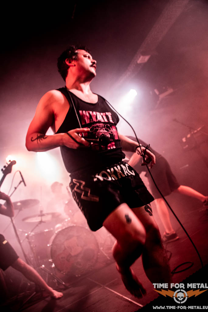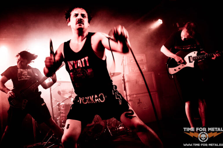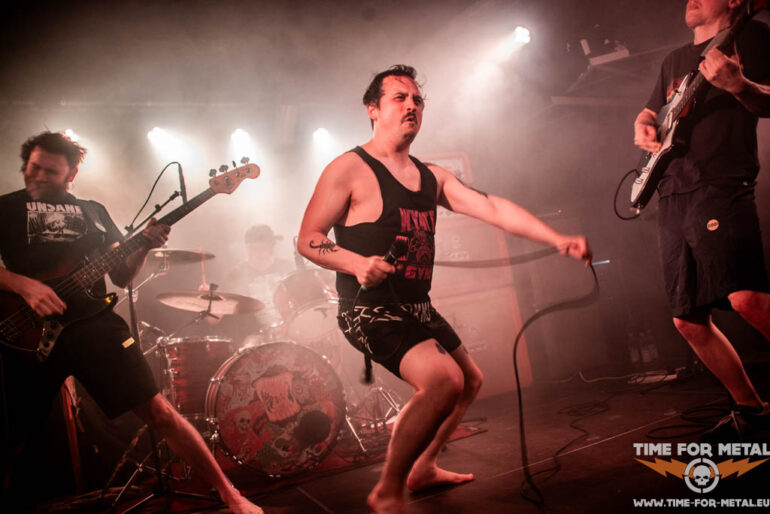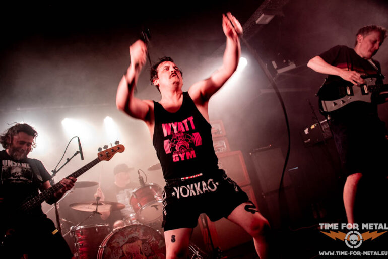 Diese chaotische Energie behält Baty auch bei seinen wohldosierten Wortmeldungen bei. Album Nummer fünf – Hilarious Death, Anlass der Tour – sei für Pigs x7 ein echter Meilenstein, erklärt er. Deshalb habe man sich auf die Suche nach „Rocklegenden“ gemacht, die weniger Alben veröffentlicht haben. Dabei sei man auf die Vengaboys gestoßen. Die haben’s nur auf drei gebracht. Auch die Vorstellung seiner Band nutzt Baty für eine Anekdote: Bei einem Festival in Polen habe ihn ein Zuschauer angesprochen: Die Band sei hervorragend, er selbst allerdings ein „Arschloch“. Den Affront scheint der Sänger bereits verwunden zu haben und legt los wie ein Wrestling-Ansager: Am Bass Randy Savage, am Schlagzeug Rowdy Roddy Piper, an der Gitarre Nature Boy Rick Flair. Und als Höhepunkt, The Undertaker an der Lead-Gitarre, direkt aus dem Death Valley.