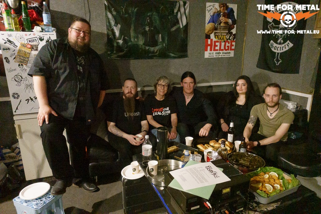 Eingeladen waren heute vier Magazine, außer mir ist allerdings nur noch Adam vom Waldhalla – Das grüne Metalmag gekommen. So stehen und sitzen wir also zu siebt um den reichhaltig gedeckten Tisch, die Play-Taste wird gedrückt, und wir lassen uns die von Ereškigal zubereiteten vegetarischen Köstlichkeiten schmecken, während der erste Track aus den Boxen schallt. Ungefähr 41 Minuten Spielzeit, aufgeteilt auf acht Songs, liegen vor uns. Ich versuche ja, relativ neutral zu schauen, aber gleich nach Song Nummer 2 kann ich mir den Kommentar „sehr sehr geil“ nicht verkneifen. Genau so mag ich schwarzmetallischen Death Metal! Weiter geht’s, und bei Song Nummer 4 kommt dann das Déjà-Vu-Erlebnis, denn den Song Absolution Denied hatten Blodtåke auch live immer dabei. Einer meiner Lieblingssongs, und die fünf haben schon im vergangenen Jahr mit einem Augenzwinkern angedeutet, dass der es auf das Album schaffen wird.