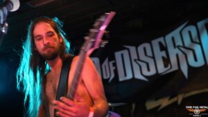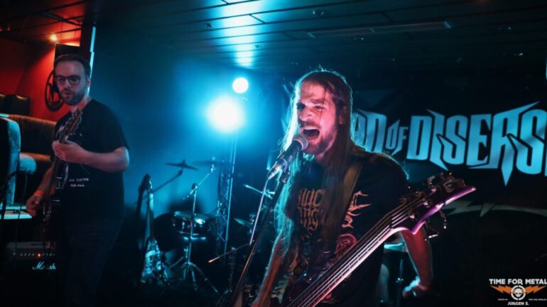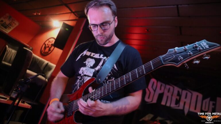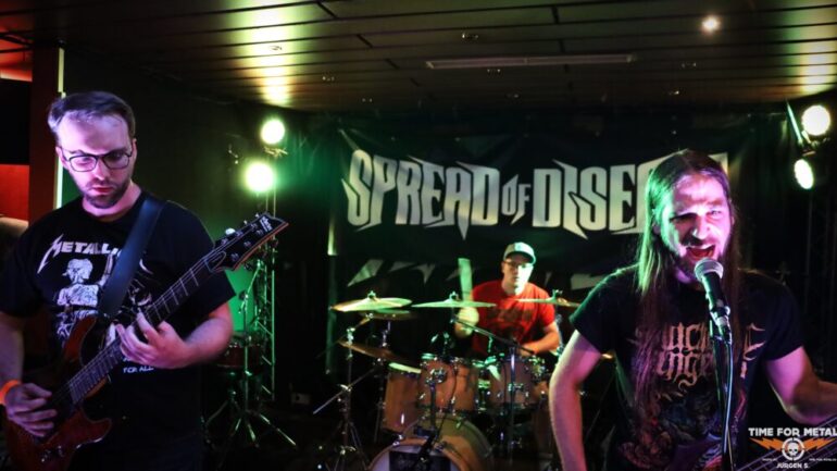 Dann beginnt es auch schon mit Spread Of Disease. Die noch junge Koblenzer Thrash Formation hat sich mittlerweile in der hiesigen Metalszene etabliert und bereits einige Gigs hinter sich! Eine Bürde, allerdings auch eine Ehre für die Jungs war es, im Mai bei den Andernach Metaldays 2024 das Festival zu eröffnen. Die Formation um Frontmann Niko Krug hat nicht nur dies mit Bravour gemacht, sondern leistet auch heute Abend ganze Arbeit. Zuerst muss ich mir allerdings die Augen reiben, denn ich sehe nur ein Trio auf der kleinen Bühne des Florinsmarktes. Bisher kannte ich allerdings die Band nur als Quartett. Niko erklärt mir anschließend, dass ihr zweiter Gitarrist recht kurzfristig aus der Band ausgeschieden ist. Den Gig hier mit Against Evil wollte man allerdings unbedingt spielen.
