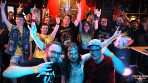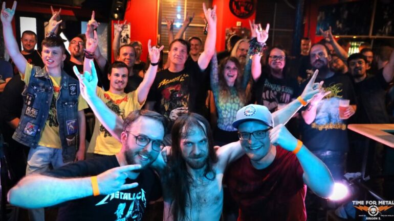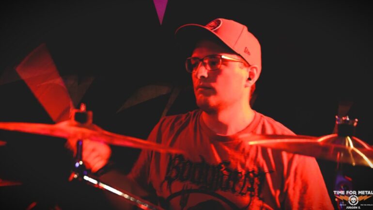Das klappt auch recht gut als Trio hier heute Abend, denn Niko und seine beiden Mitspieler legen hier richtig gut los und zünden schon mal als Pyromaniacs das Feuer hier im Florinsmarkt. Die Jungs werden von Strahlern noch einmal extra angeleuchtet, was natürlich vorteilhaft ist, um Bilder von der Band zu machen, allerdings die Hitze für die Musiker auf der Bühne nochmals erhöht. Bassist und Sänger Niko zeigt bei seiner Performance ein Grinsen wie Jack Nicholsen in Shining 😀 Echt eine coole Show, in der sie unter anderem auch die Songs Deadmen’s Curse, The Art Of Violence und The Giant bringen. Zwischendurch entledigt sich Niko seines T-Shirts und kommt verschwitzt seinem Double Jack Nicholson noch ein Stück näher 😀 Die Old School Thrasher hier gehen voll mit und schlagen zurück / Fight Them Back! Zwischendurch muss ich aufgrund der Hitze allerdings immer mal wieder raus, wie auch anschließend bei Against Evil. Schnell sind die Jungs schon am Ende ihrer heutigen Setliste. Als Zugabe gibt es noch den Sodom-Klassiker The Saw Is The Law. Absolut klasse Show der Koblenzer Jungs, die hier schwer eingeheizt haben.