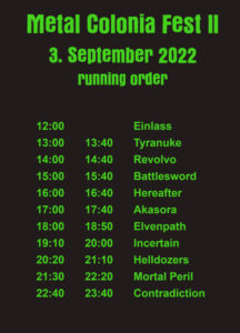 Somit nehmen folgende Bands am Metal Colonia Fest 2022 teil: Contradiction, Mortal Peril, Helldozers, Incertain, Elvenpath, Bleed, Hereafter, Battlesword, Revolvo und Tyranuke.
