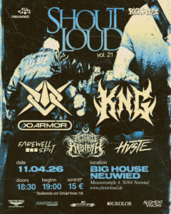Am 11.04.2026 heißt es im Big House in Neuwied wieder Shout Loud! Seit Luca Schüller und Florian Hilger 2013 in Zusammenarbeit mit dem Kinder- & Jugendbüro der Stadt Neuwied die Organisation von Konzerten starteten, wurde die Shout Loud Eventserie in Neuwied eine echte Erfolgsgeschichte. Zig verschiedene Bands konnten bereits einem größeren Publikum präsentiert werden, mehr als 2.000 Besucher kamen in den Jahren insgesamt zur Konzertreihe. Neben zahlreichen lokalen Bands schaffte es das Team, auch überregional bekannte Bands zu buchen, um für noch mehr Abwechslung im Programm zu sorgen. Shout Loud steht für günstige Eintrittspreise, faire Getränkepreise und ein spannendes Programm. Auch für Snacks und kostenfreie Parkplätze ist stets gesorgt.