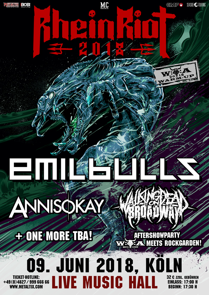 Die Emil Bulls aus München gehören seit über 20 Jahren zur Speerspitze der deutschen Szene und bleiben mit ihrem aktuellen Album Kill Your Demons weiter auf Erfolgskurs. Unzählige ausverkaufte Konzerte – unter anderem auch in der Live Music Hall – sprechen für sich. Annisokay aus Sachsen vermischen Hardcore, Metal und Rock mit poppiger Note zu ihrem ganz eigenen Stil und konnten so im Laufe ihrer zehnjährigen Karriere unzählige Fans um sich scharen. Für 2018 versprechen sie Großes, ihr Auftritt beim RheinRiot wird dazugehören. Mit Walking Dead On Broadway steht außerdem Deathcore auf dem Programm – ungezähmt, versiert und brutal. Die Band aus Leipzig hat jüngst einen Sängerwechsel verkündet und ist nun bereit, wieder in die Vollen zu gehen.