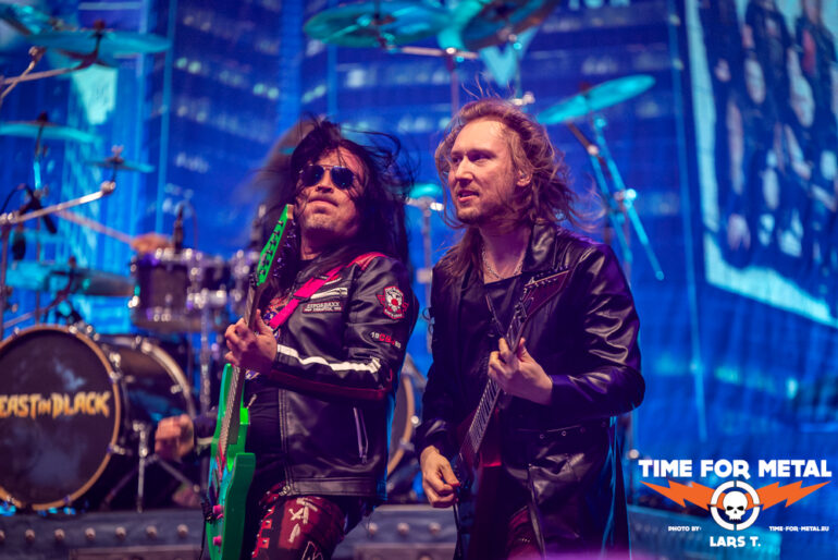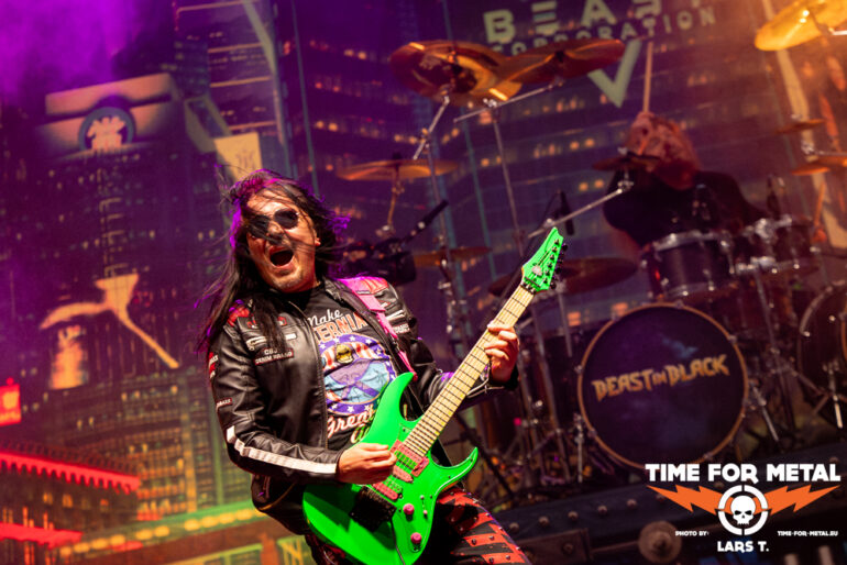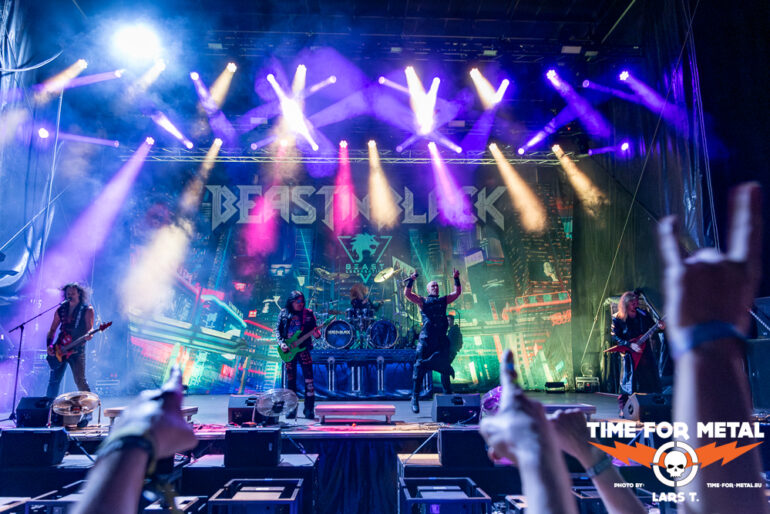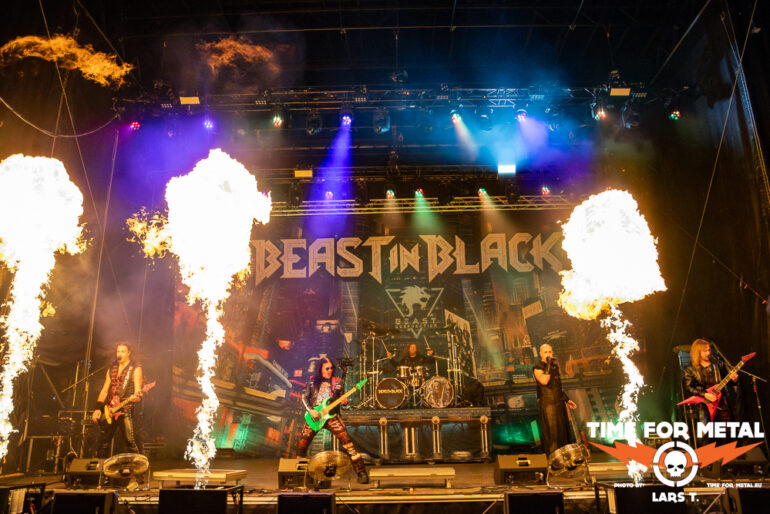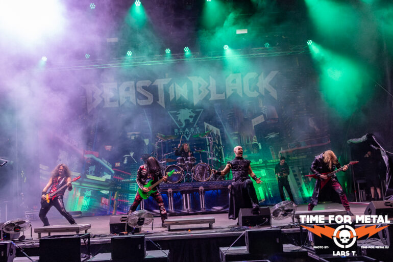 Den Schlusspunkt am ersten Festivaltag setzen bunte und fröhliche Töne. Aber fangen wir mit dem Namen der Band an. Beast In Black, das passt nicht. Beast In Colours wäre deutlich treffender. Quietschbunt von den Gitarren bis zur verwendeten Pyrotechnik präsentieren sich die Finnen. Ein Blick auf das aktuelle Werk Dark Connection zeigt den bunten und poppigen Ansatz der Truppe, der wie Metalite vor allem die jüngere Generation abholt. Aktuell ist noch das Album aus dem Jahr 2021. Aber bereits zwei Singles mit Power Of The Beast und Enter The Behelit präsentieren Beast In Black, immer unterlegt von Dingen, die wahlweise bunt knallen oder zischen. Insgesamt knapp 90 Minuten rocken die Herren und liefern einen Querschnitt ihrer bisherigen Diskografie, wobei die drei veröffentlichten Alben quasi gleichmäßig bedacht werden. Die Truppe trifft den Nerv des feierwütigen Publikums und gibt den Veranstaltern recht, auf junge und neue Bands zu setzen im Vergleich zu Rage oder Dirkschneider 2024.